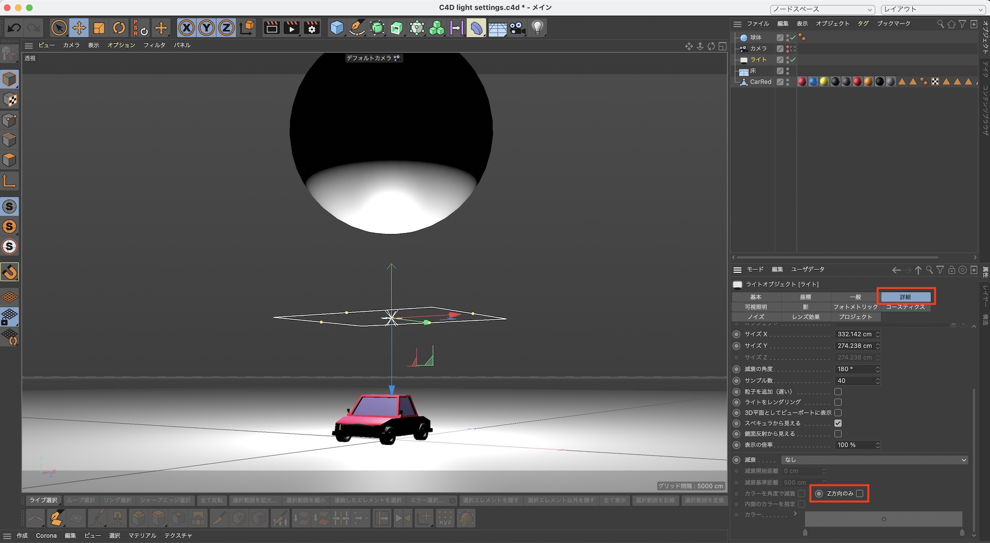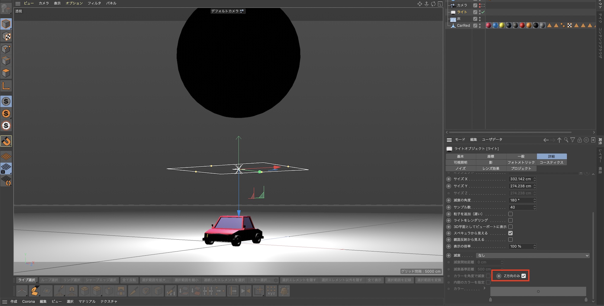 ライトオブジェクトを選択して属性マネージャ内の「詳細」、「Z方向のみ」のオプションを入れるとZ軸(青い矢印のある方向)のみに光が放射されます。上の例では「Z方向のみ」にチェックを入れていないため、車とライトの上にある球体にも光が当てられています。