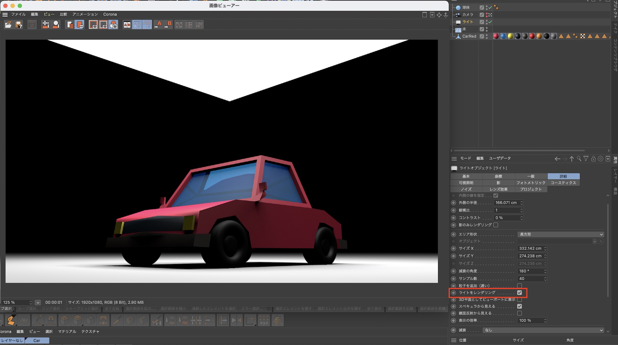 レンダリング時にライトオブジェクトをあえて映したい場合、またはその逆で隠したい場合は「詳細」の項目にある「ライトのレンダリング」のチェックを切り替えると良いでしょう。