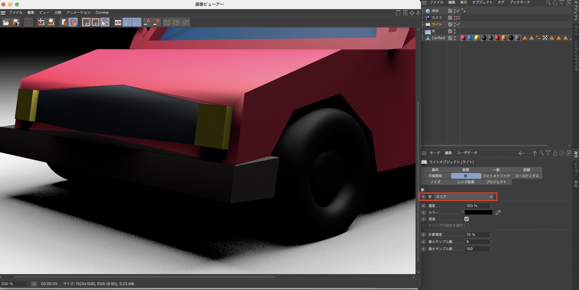 ライトオブジェクトの影では「エリア」、「シャドウマップ(ソフト)」、「レイトレース(ハード)」の3種類が利用できます。「エリア」は自然の影に近い形でレンダリングしてくれる一方、比較的レンダリング時間が長めのものです。