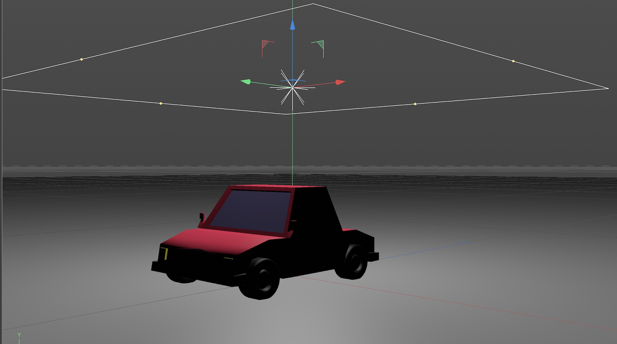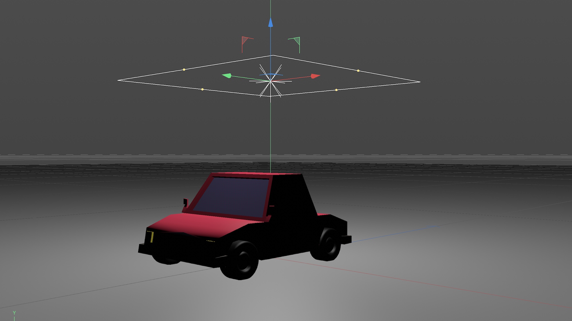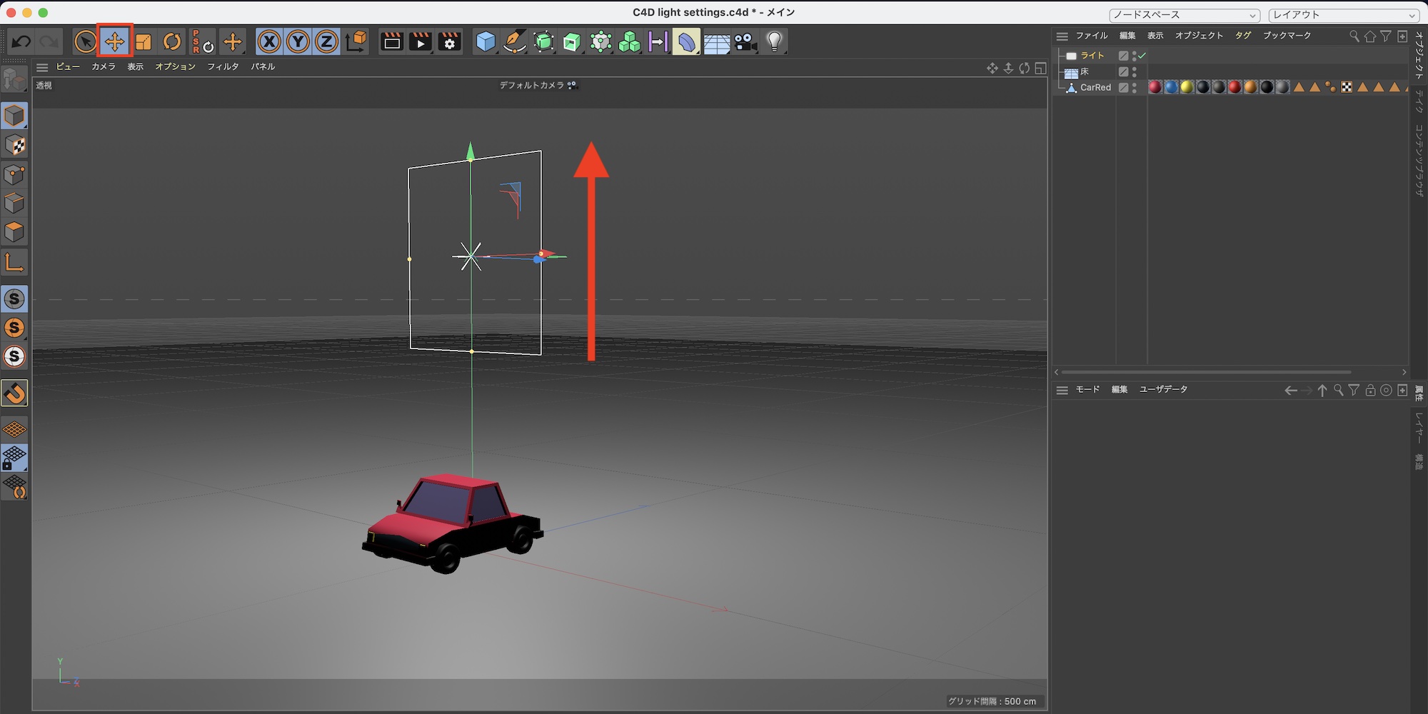 ライトオブジェクトが追加されたことによりデフォルトライトが無効化し、ビューポートが暗くなります。ライトオブジェクトを移動ツールを使って車の上部に配置しましょう。