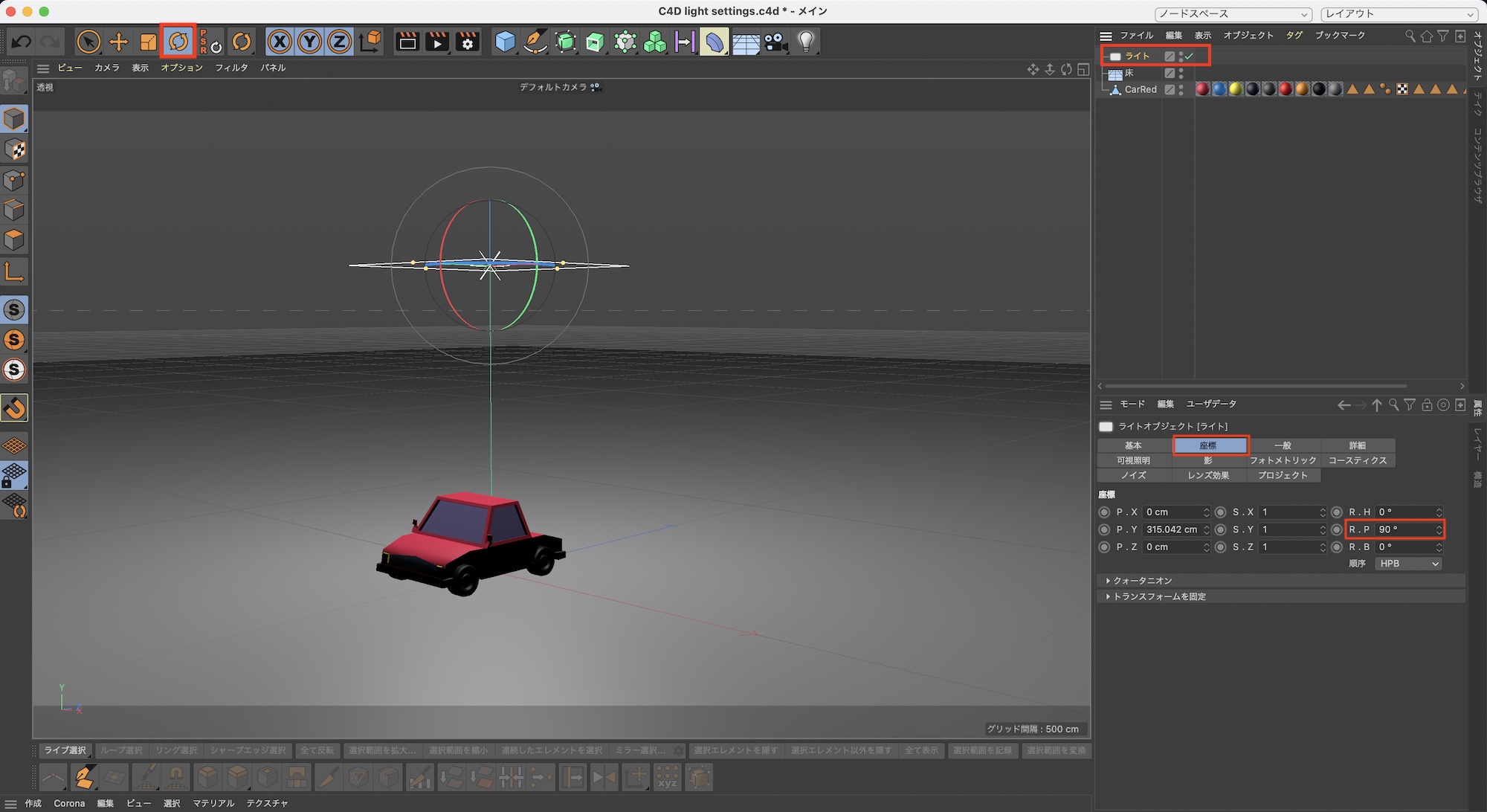 次に回転ツールを使用してエリアライトのZ軸が車の方向に向くように調整します。エリアライトを選択して、属性マネージャの「座標」から「R.P」の数値を「90°」に変更でも行えます。