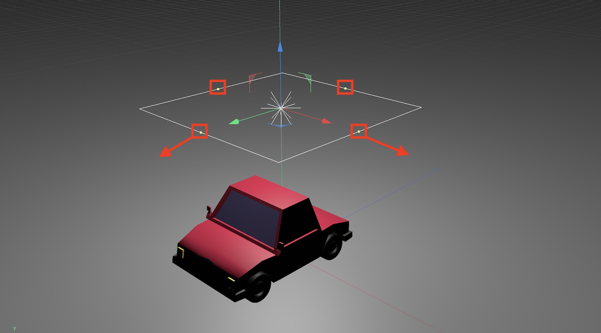 エリアライトは被写体から離すことで光が広がり、柔らかい感じを出す効果を与えられるので、車のオブジェクトから少し離す感じで配置すると良いでしょう。エリアライトは実際の照明で取り付けられるソフトボックス(ディフューザー)と同じ役割を果たします。