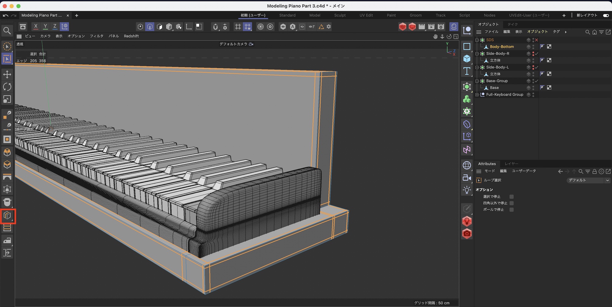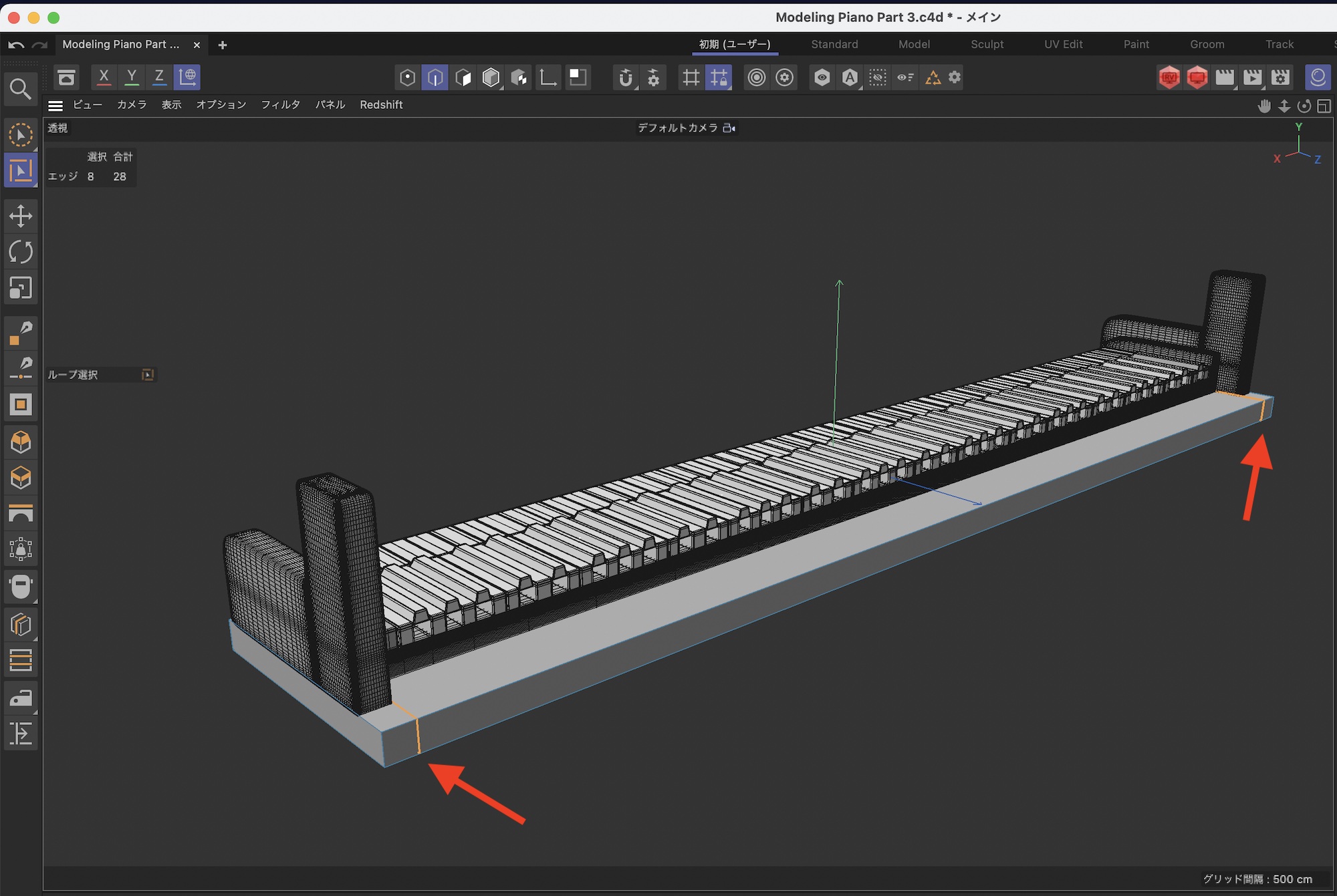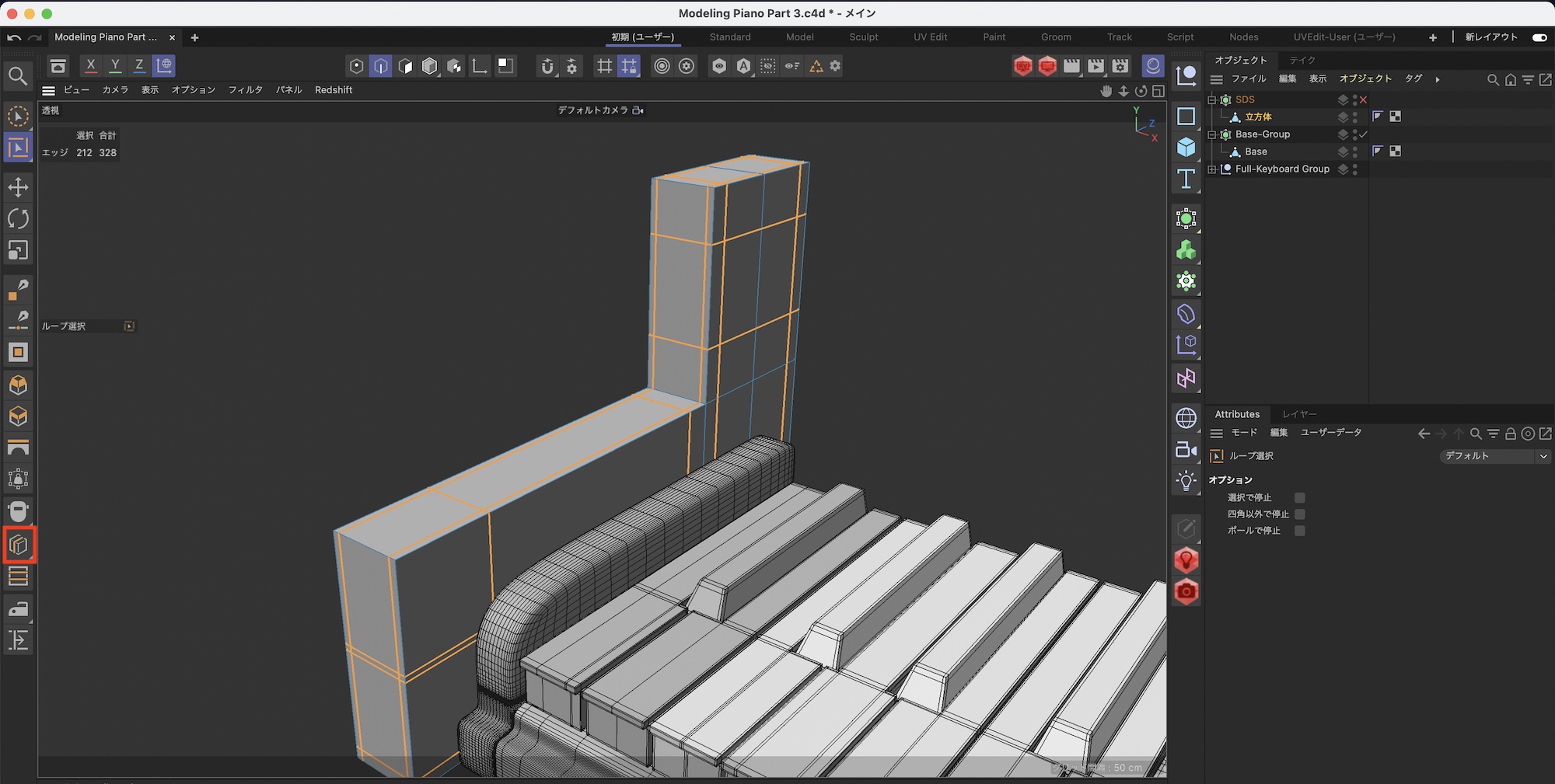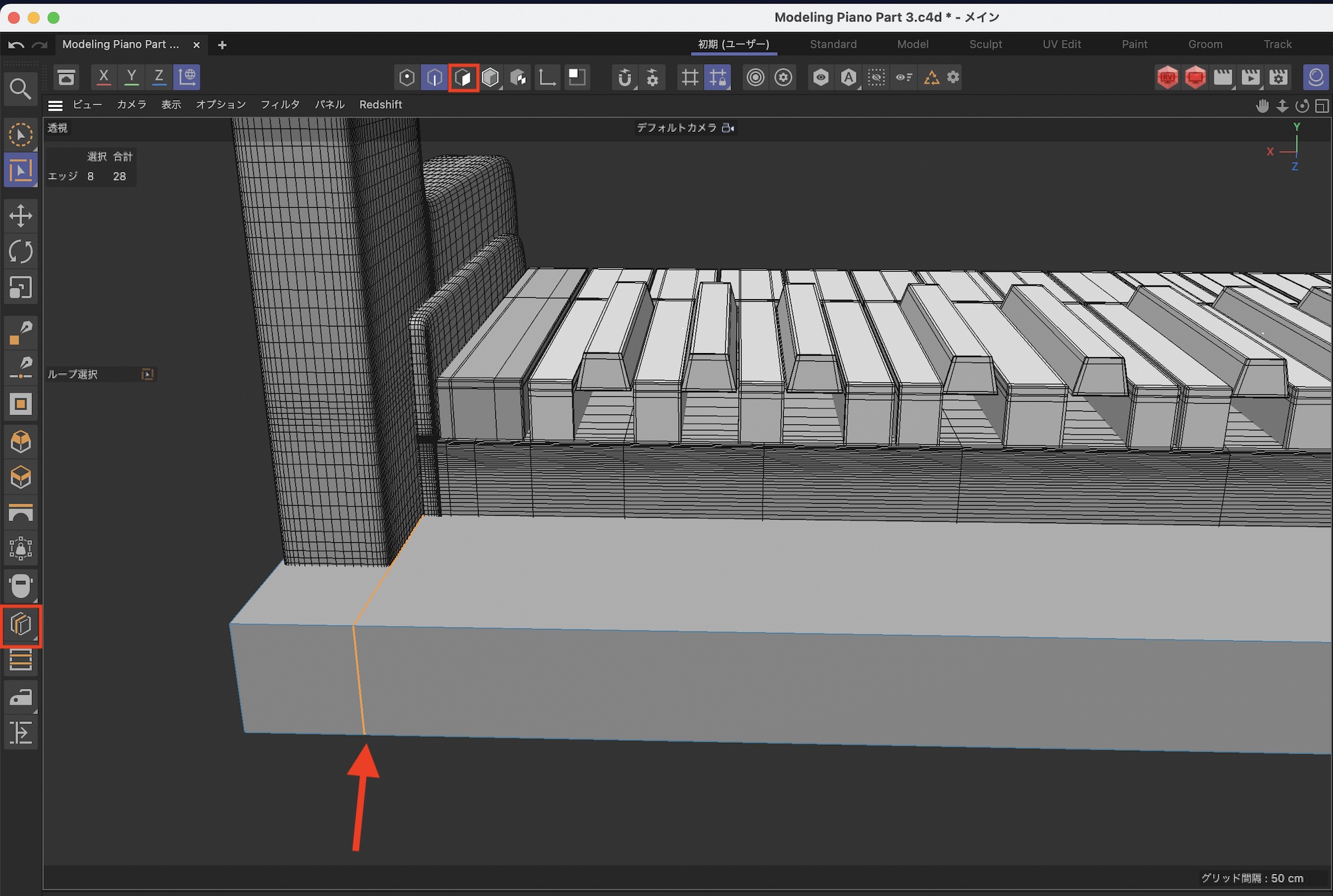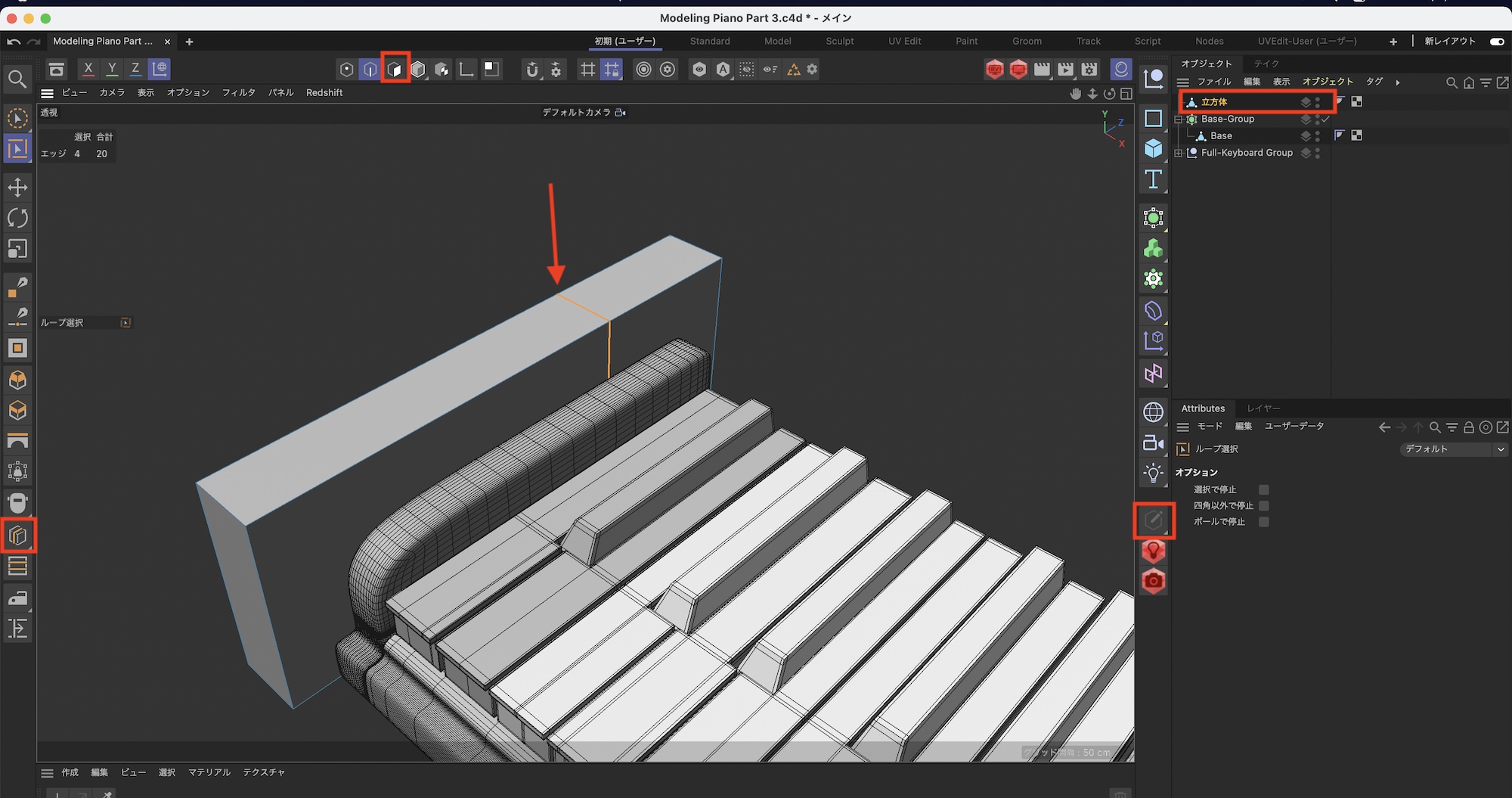 さらに鍵盤の後ろあたりをループカットでカットします。