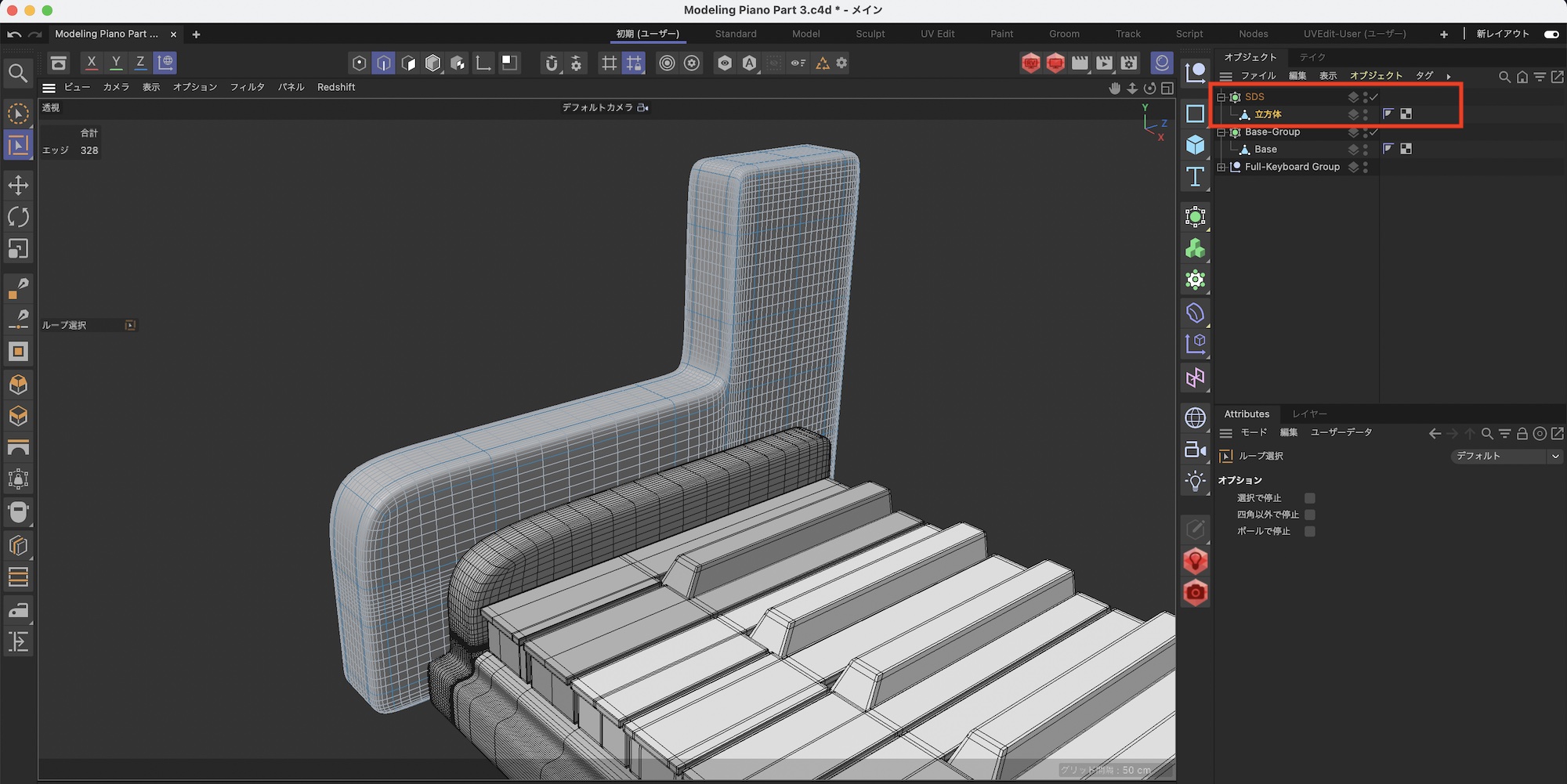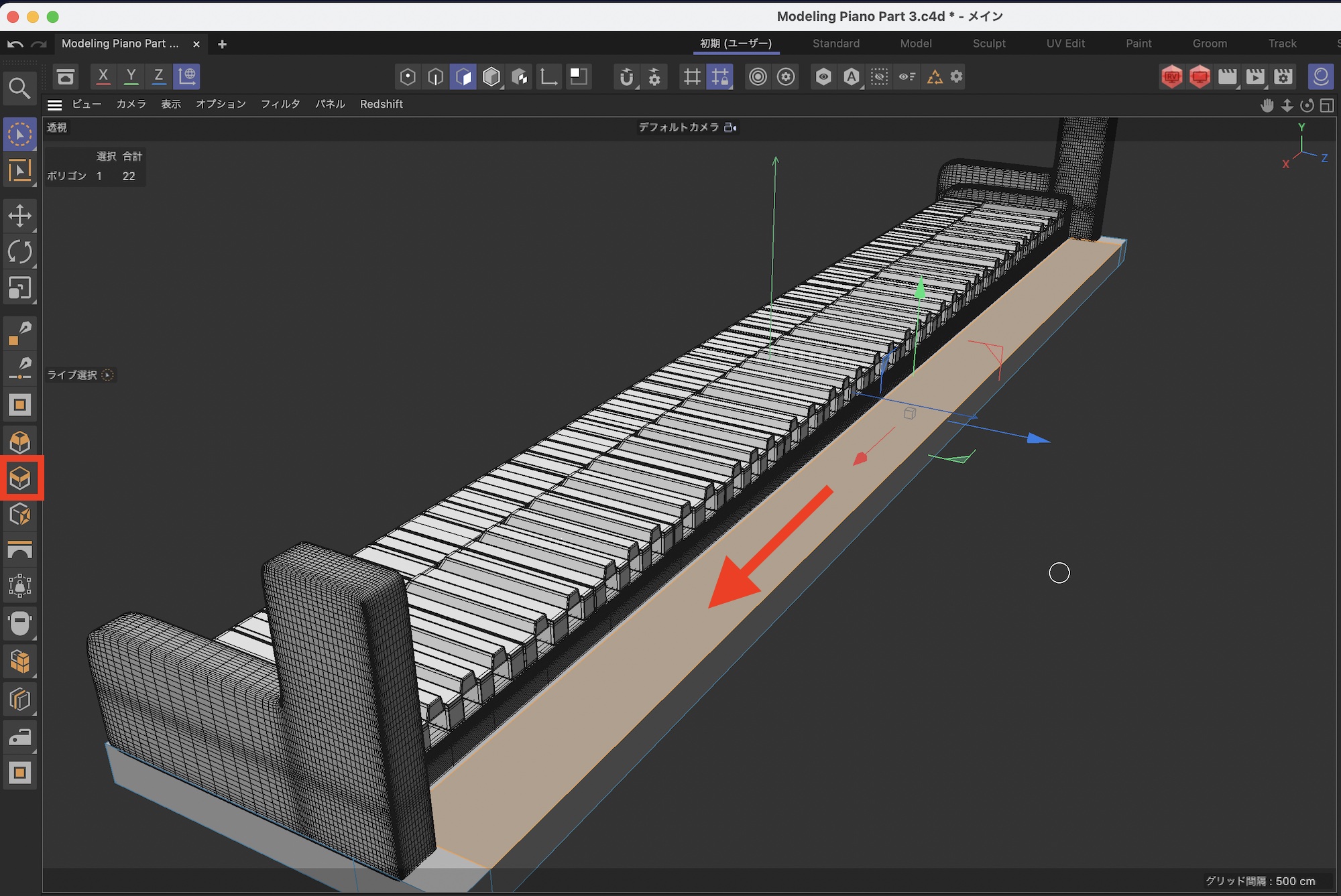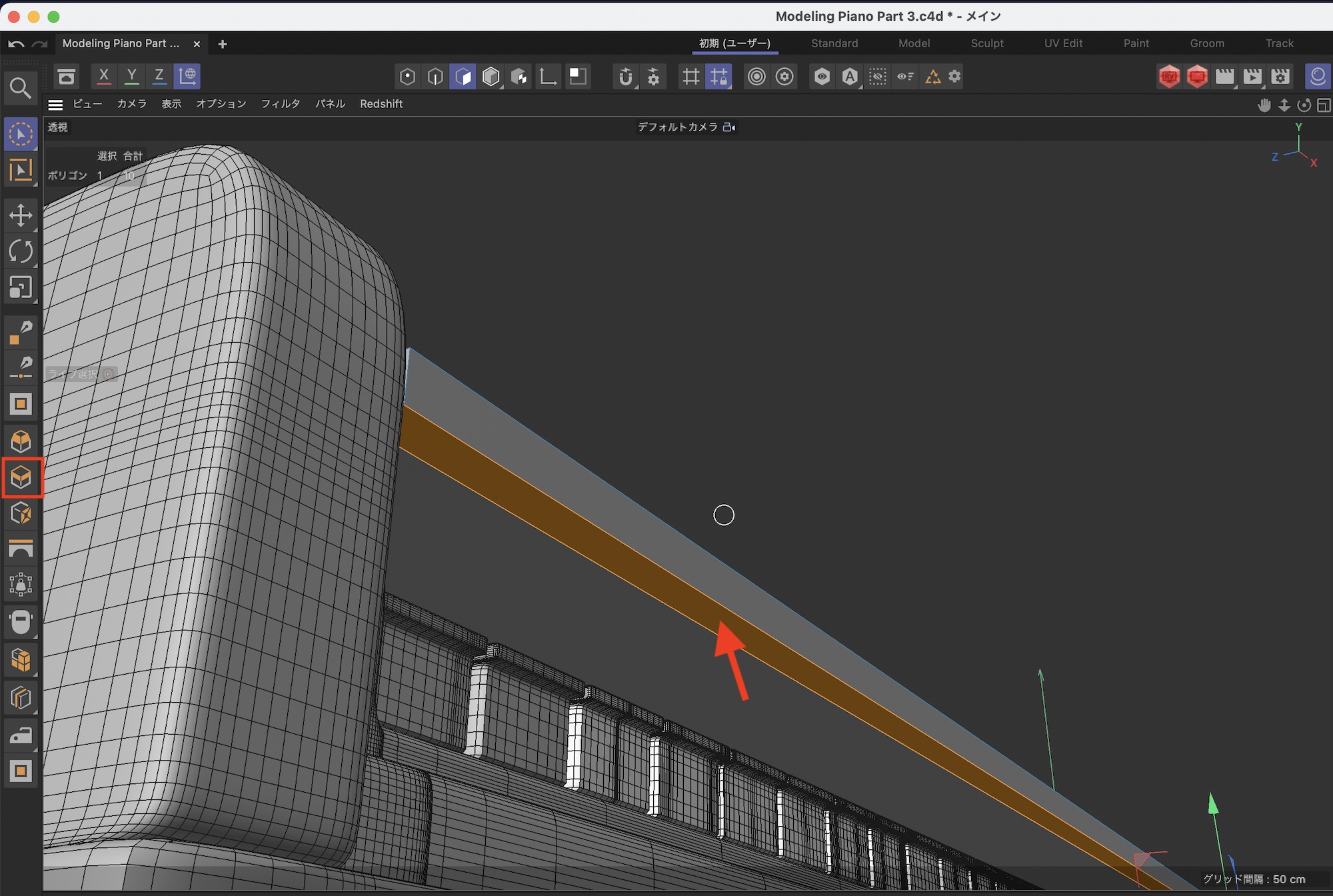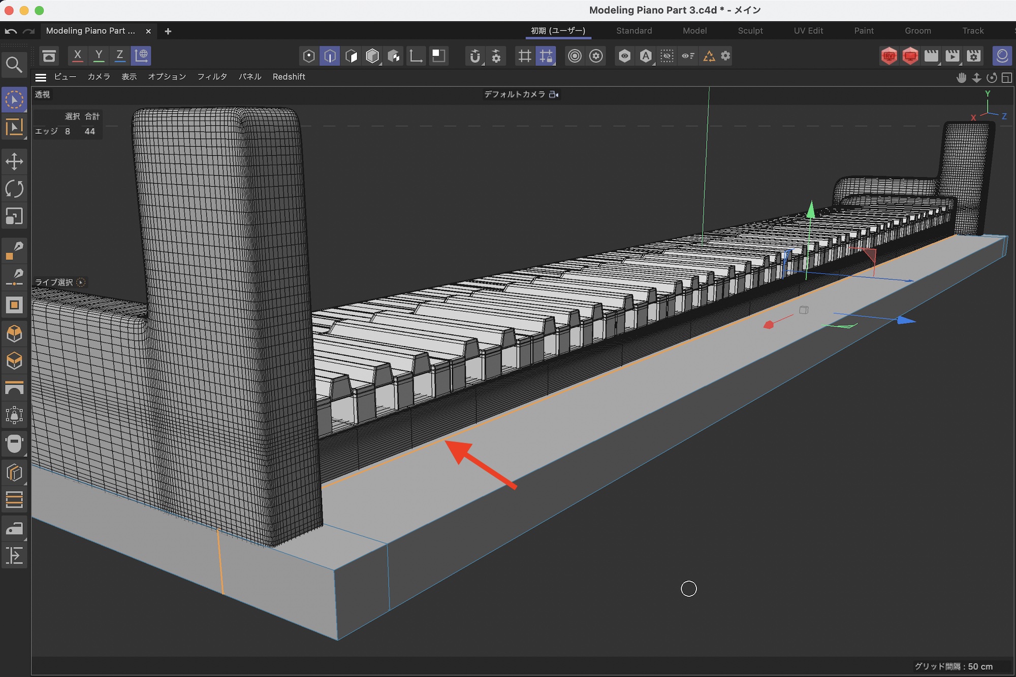 さらに鍵盤の後ろあたりをループカットでカットします。