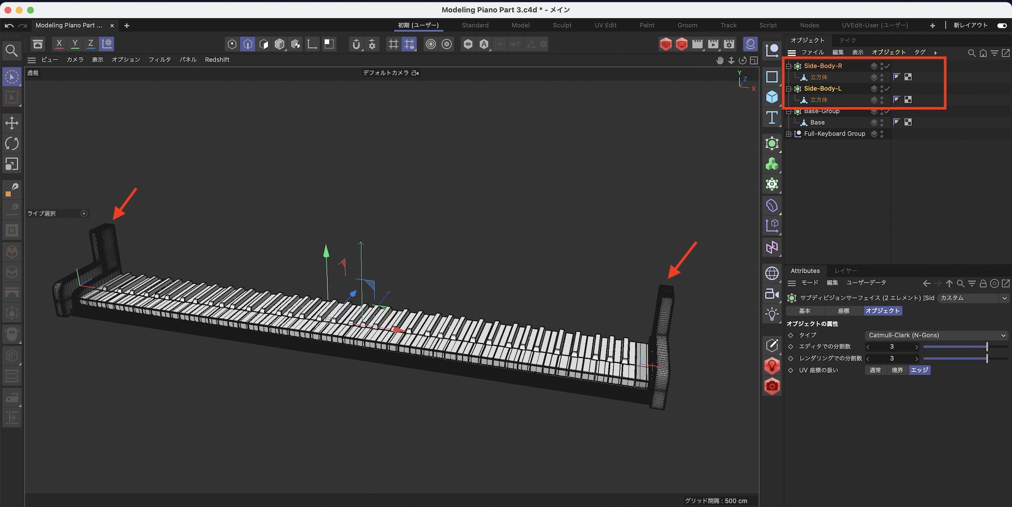 作成したオブジェクトは「SDS」から「Side-Body-L」と名称変更し、複製して鍵盤の左に配置しましょう。複製したオブジェクトは「Side-Body-R」にします。