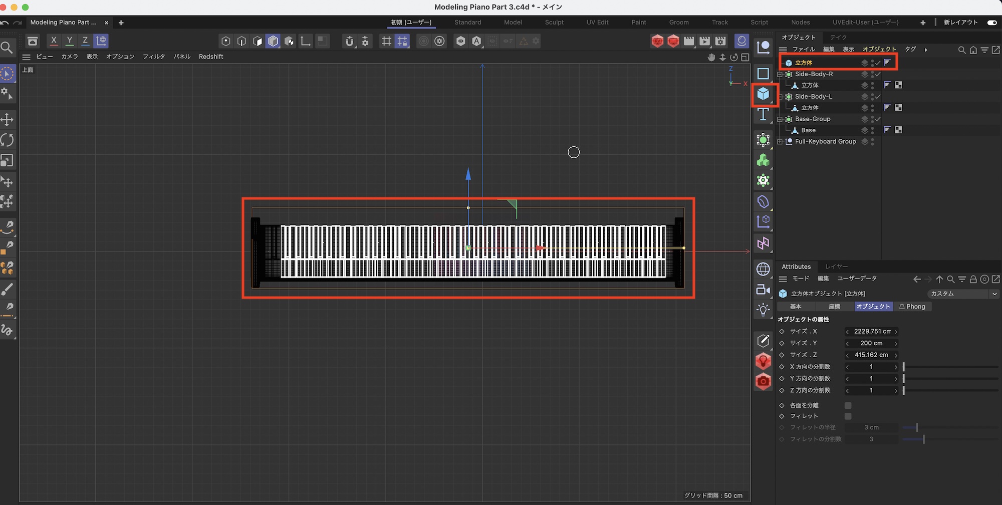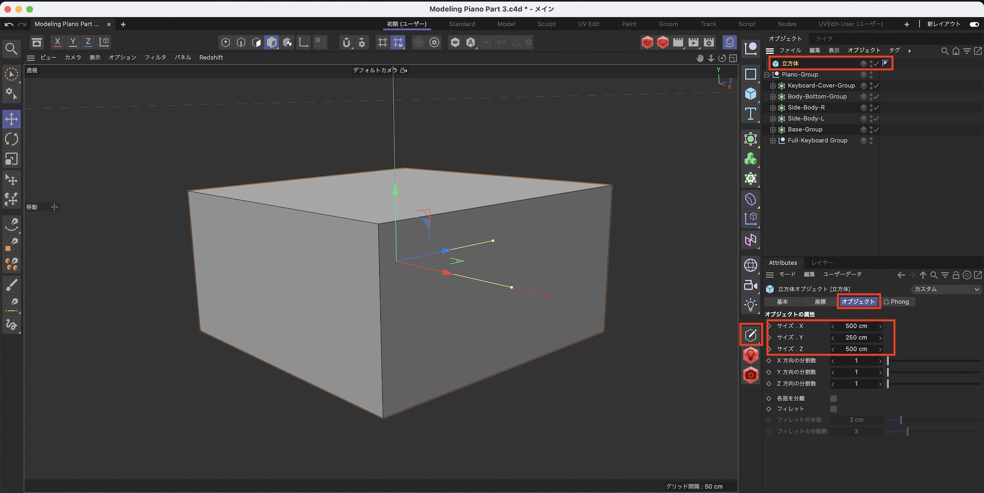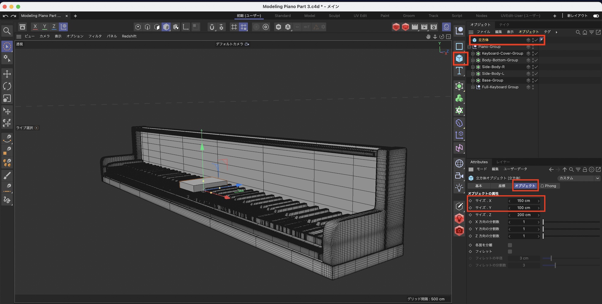 ピアノのサイズを調整した後は立方体を選択して、属性マネージャの「オブジェクト」から「サイズX: 500cm」、「サイズY: 250cm」、「サイズZ: 500cm」にして「編集可能にする」をクリックしてオブジェクトを変換しましょう。