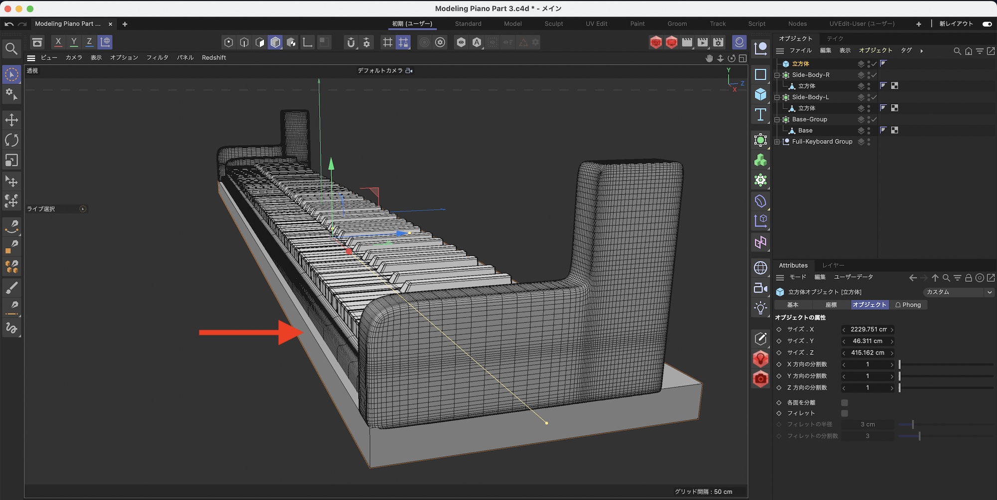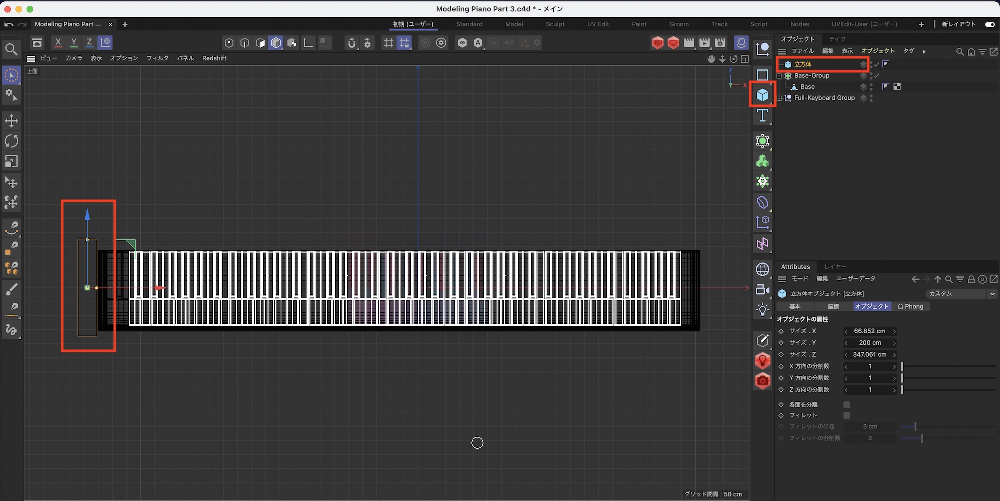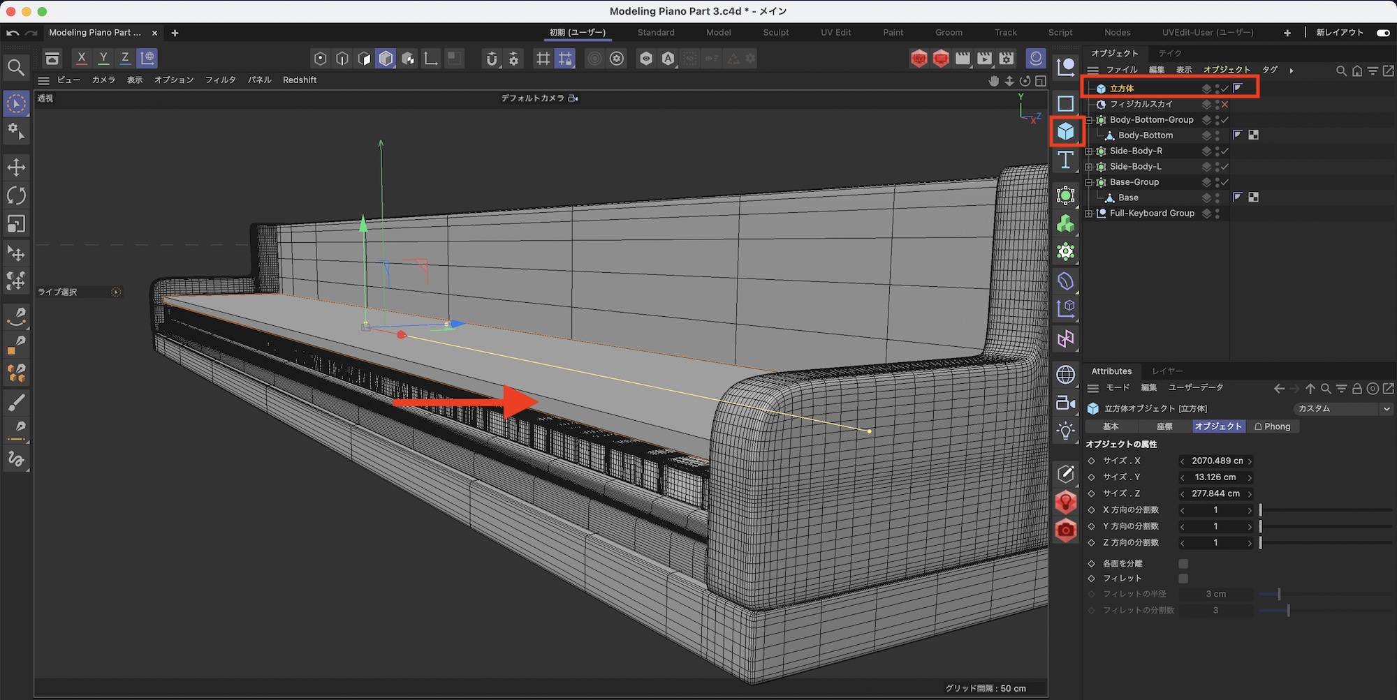 ピアノのサイズを調整した後は立方体を選択して、属性マネージャの「オブジェクト」から「サイズX: 500cm」、「サイズY: 250cm」、「サイズZ: 500cm」にして「編集可能にする」をクリックしてオブジェクトを変換しましょう。