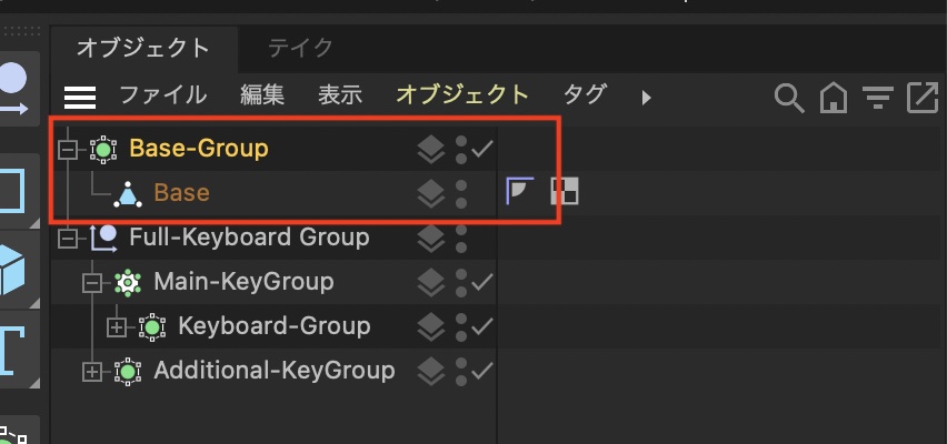 前回の記事ではここまで作成しました。鍵盤の下に配置するベースが入った「SDS」の名称がそのままなので、「Base-Group」という名称に変更しておきましょう。