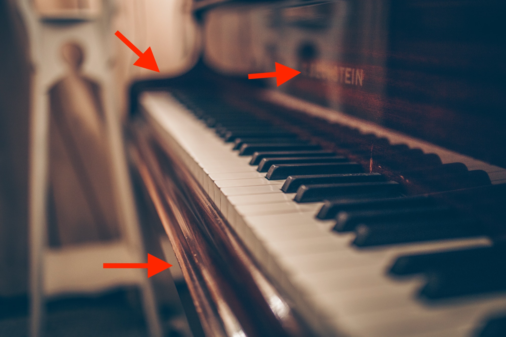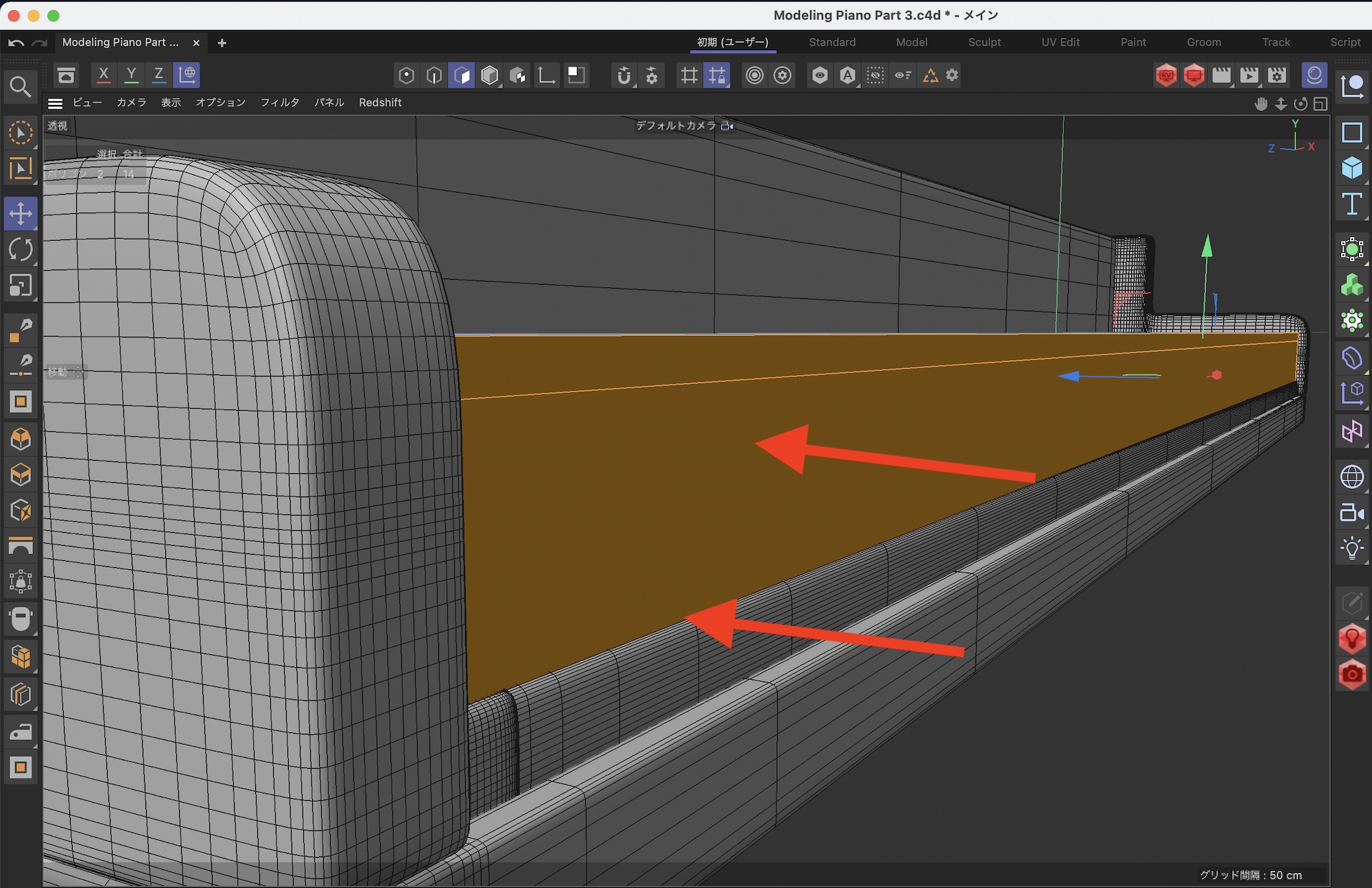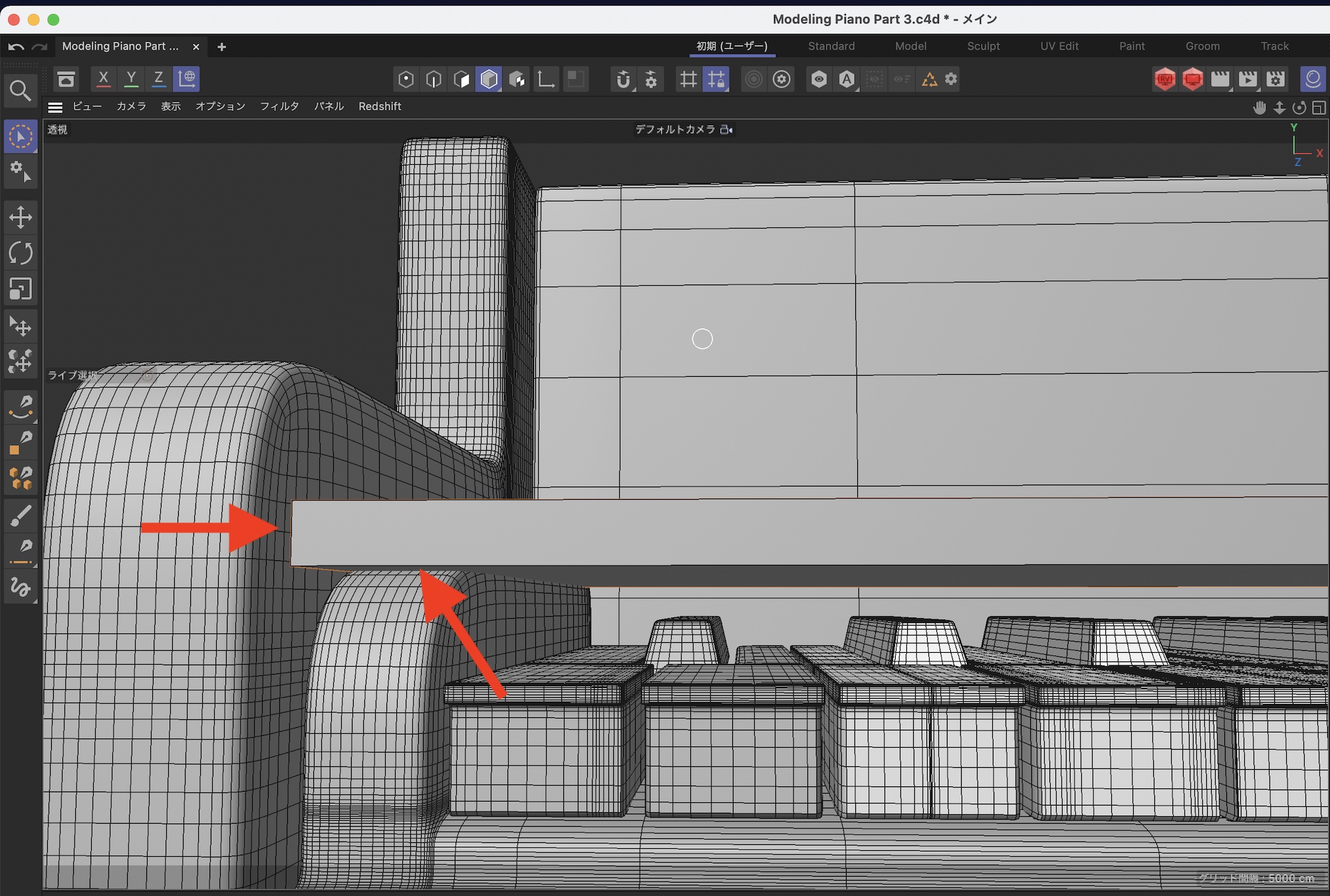 今回モデリングを行う範囲はこの3つの矢印の部分。前回のチュートリアルではベースの部分は完成したので、ベースを囲うピアノのボディをモデリングしていきます。