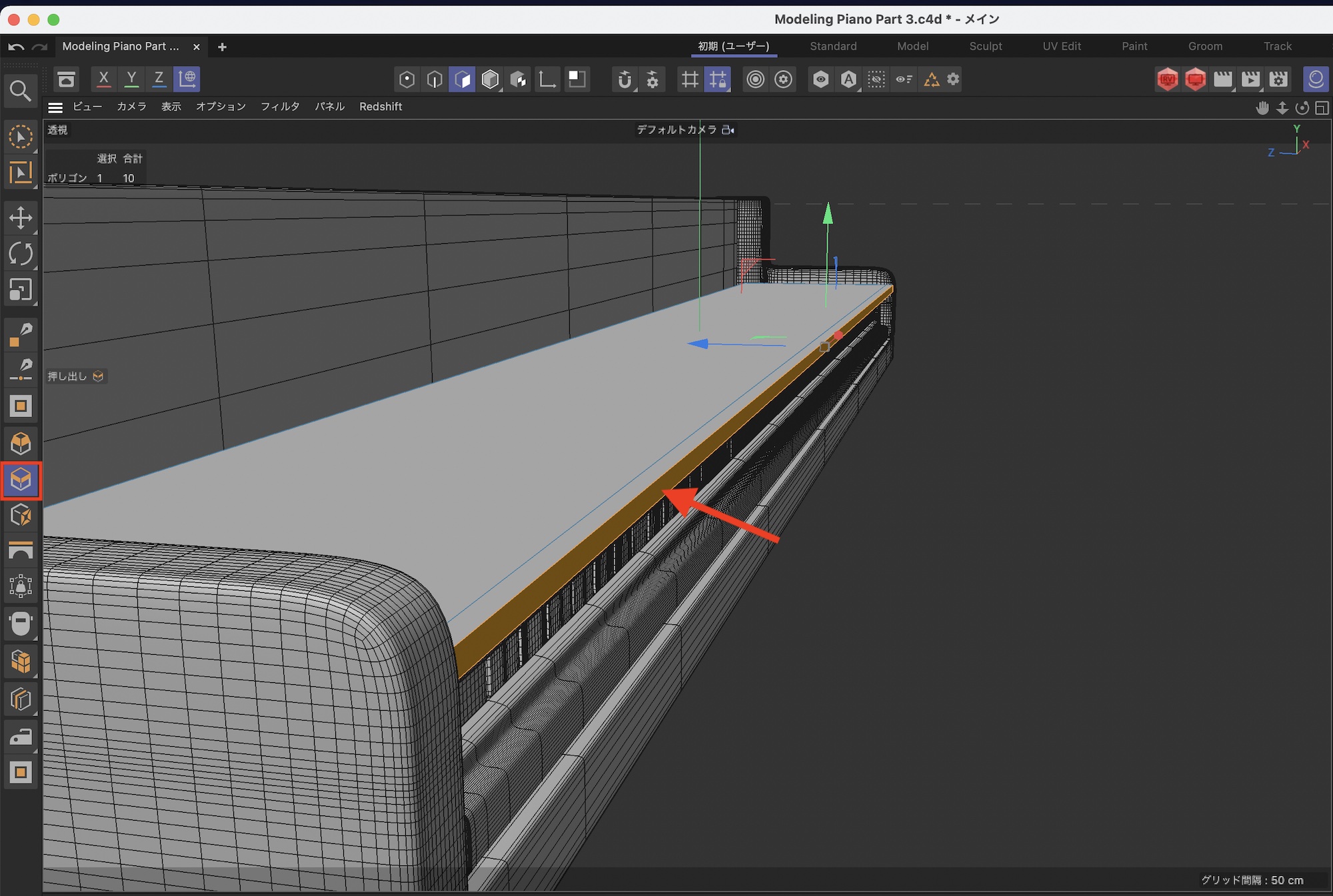 オブジェクトの前のポリゴンを選択して押し出しを行います。