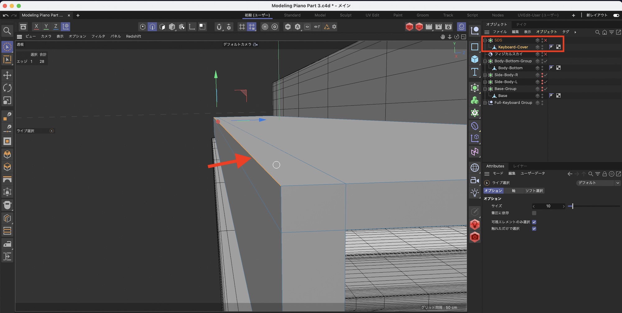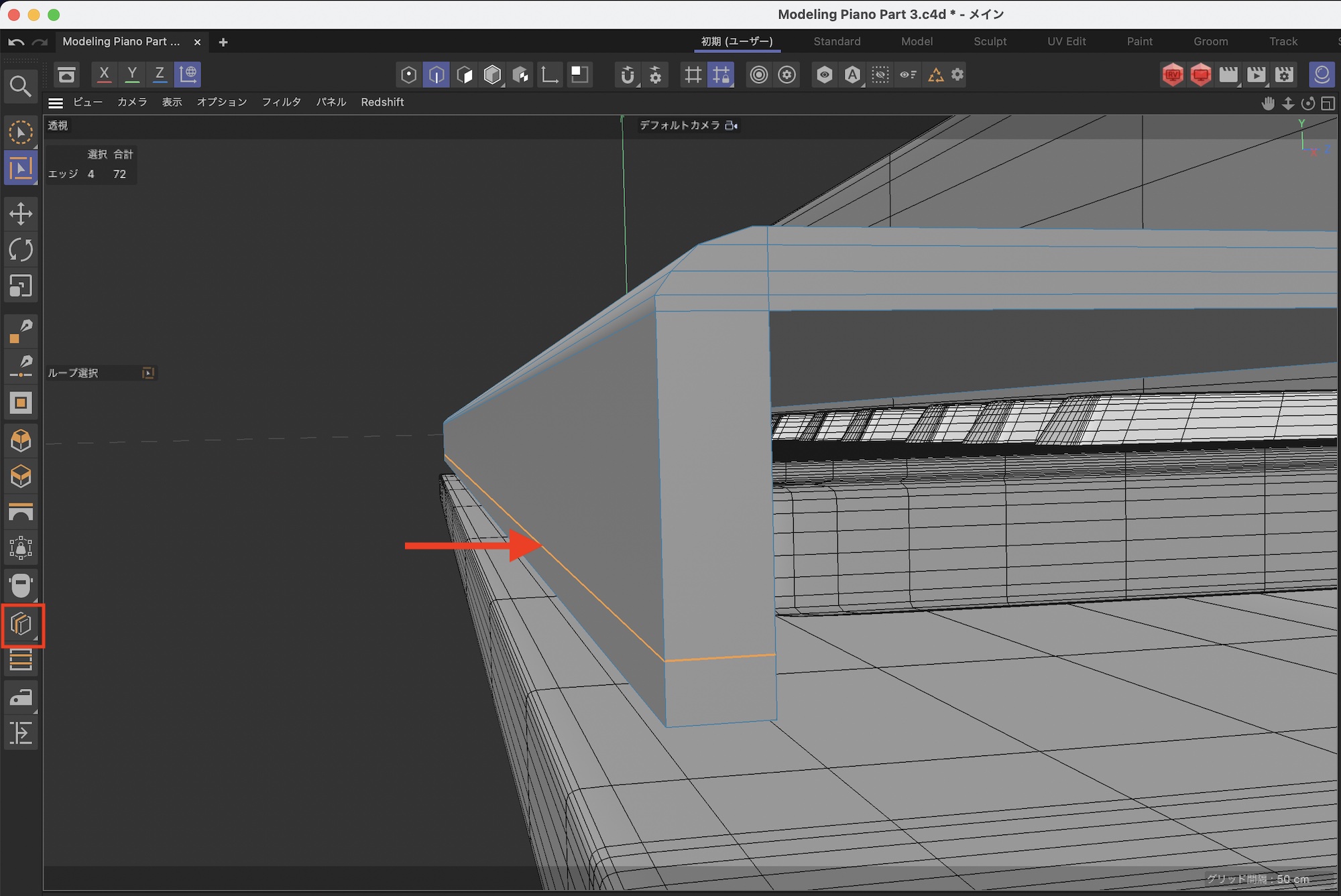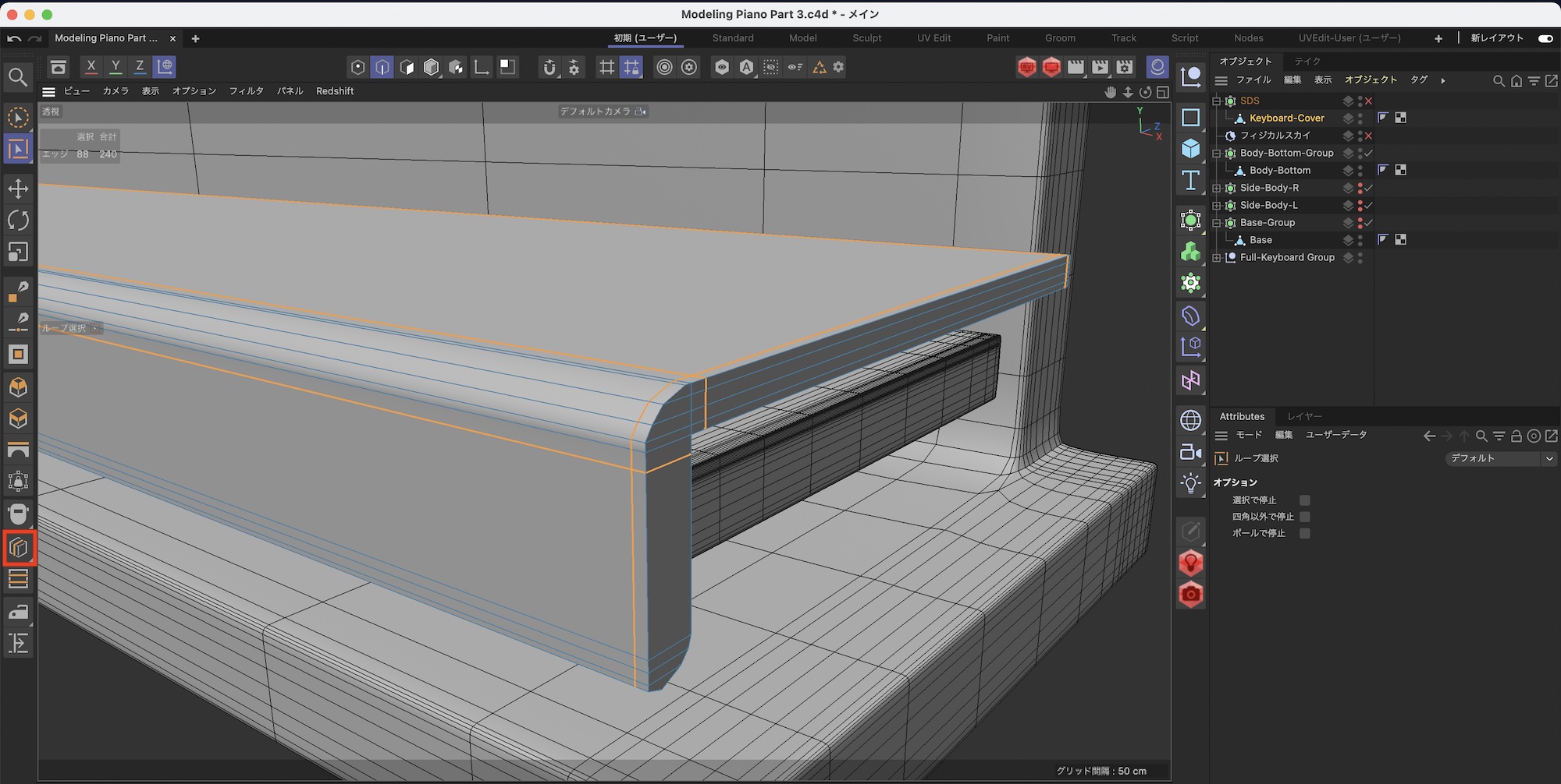 鍵盤蓋の下の部分も形を整えます。まず、ループカットを一つ追加します。