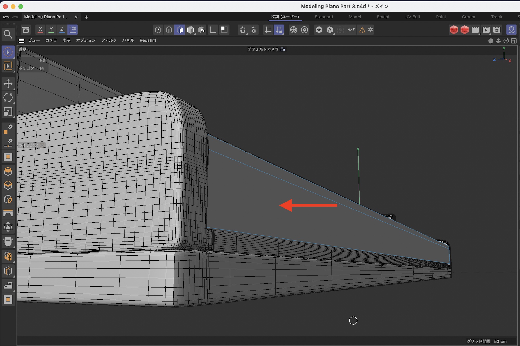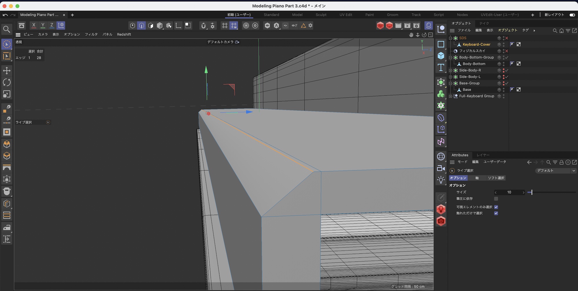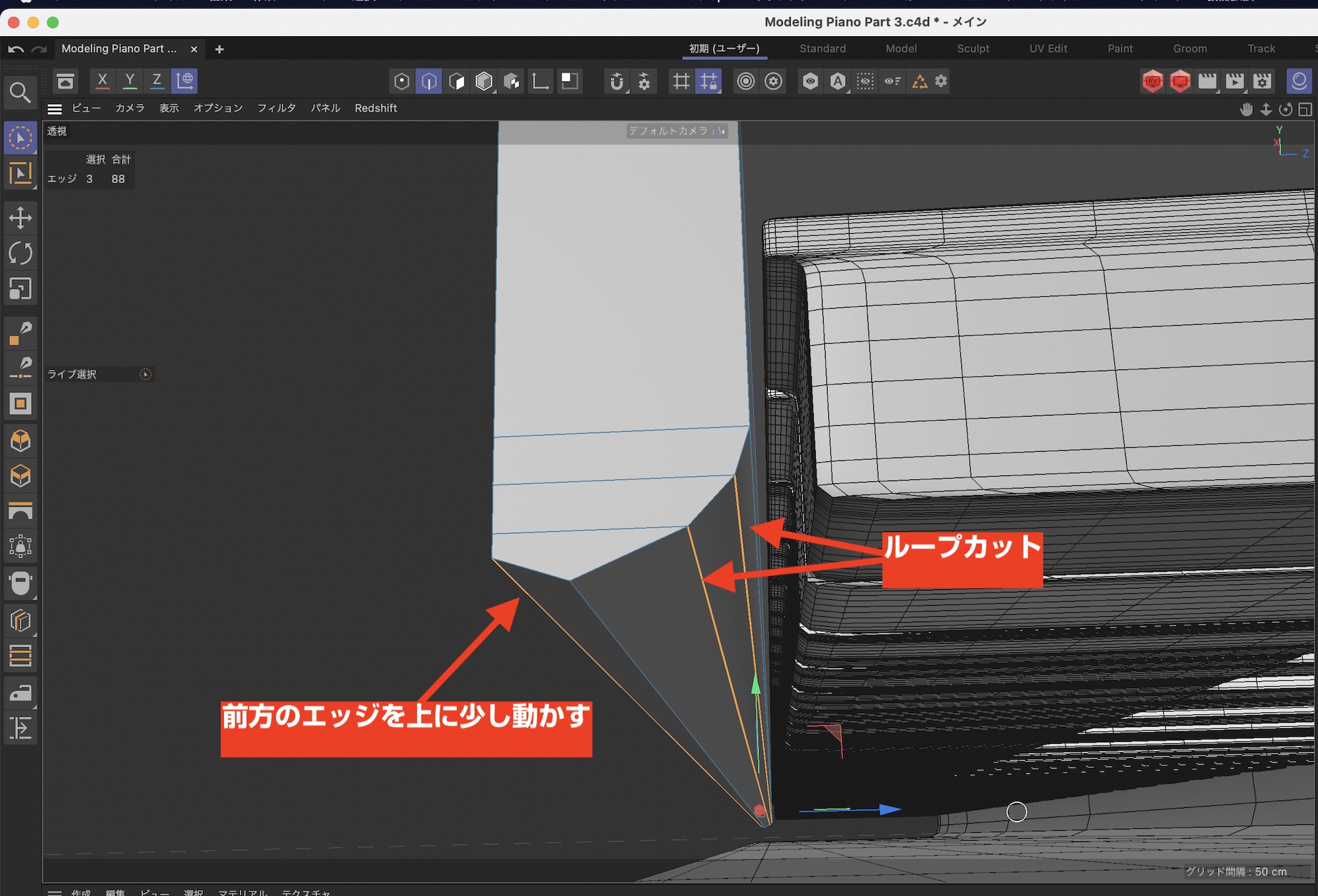 鍵盤蓋の下の部分も形を整えます。まず、ループカットを一つ追加します。