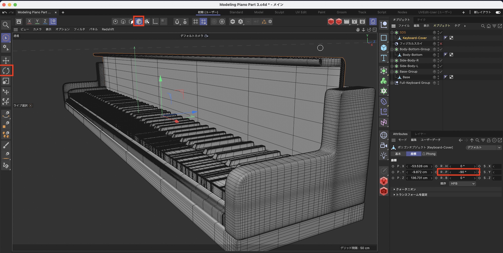 今のままだと鍵盤蓋が閉じた状態になっているので、鍵盤蓋のオブジェクトの回転軸を変更して調整します。
