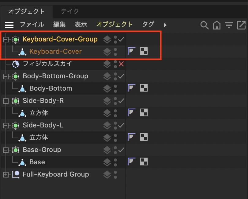 立方体を編集可能にし、名称を「Keyboard-Cover」に変更します。