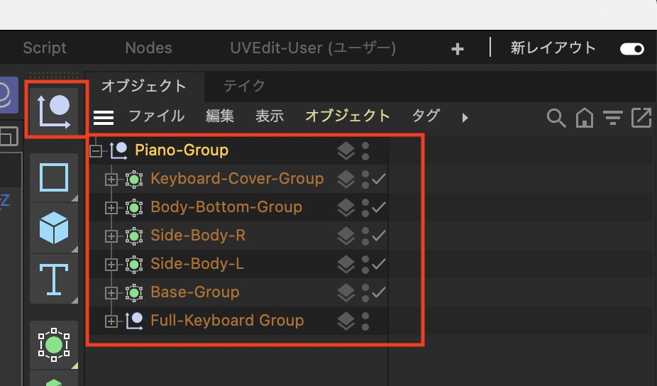 まずはピアノのオブジェクトをヌルオブジェクトの中に格納して、グループ化しましょう。
