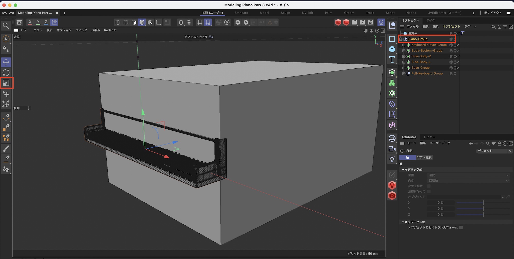 「Piano-Group」を選択して、立方体の横幅に合うようにスケールを使ってサイズを調整します。