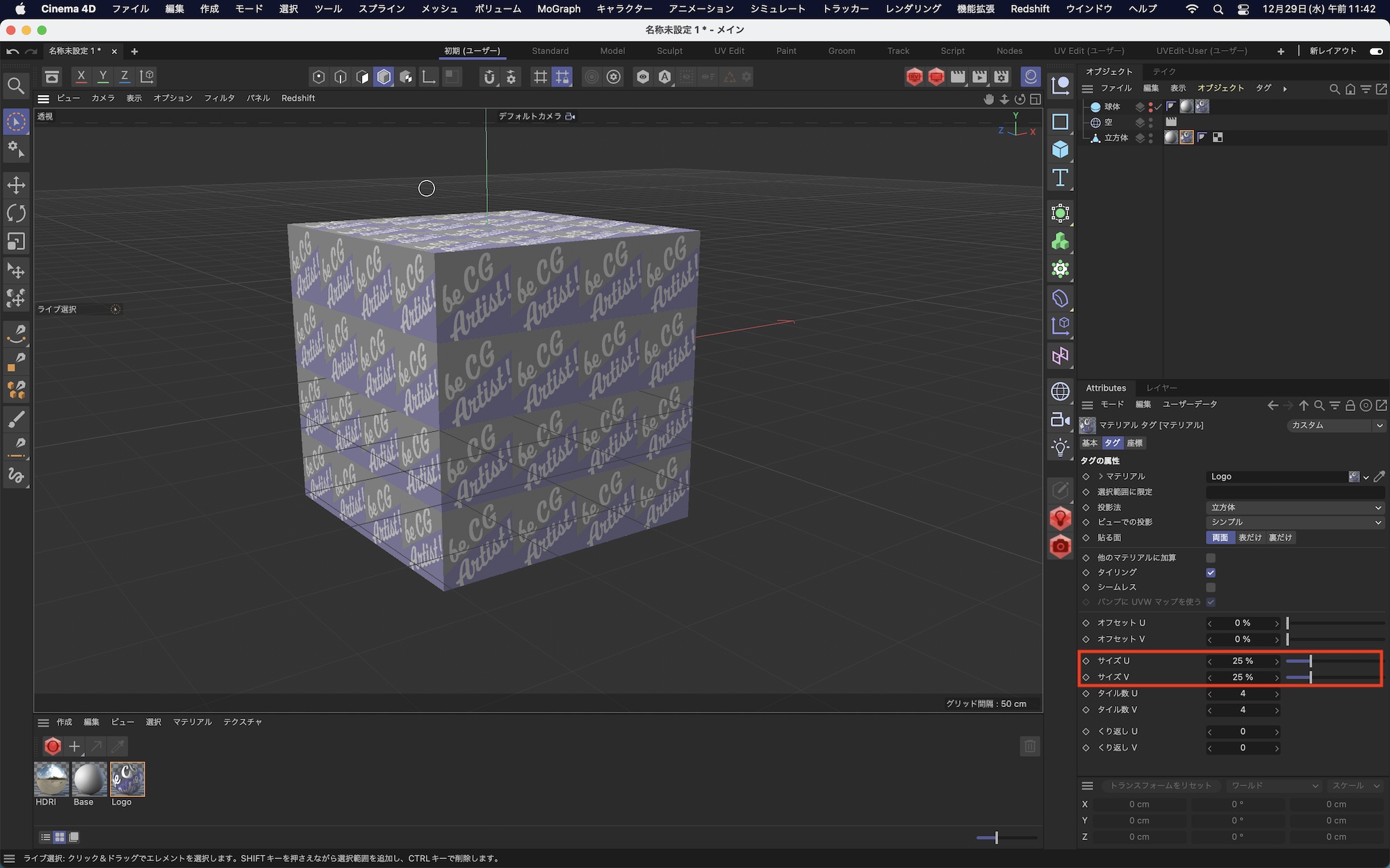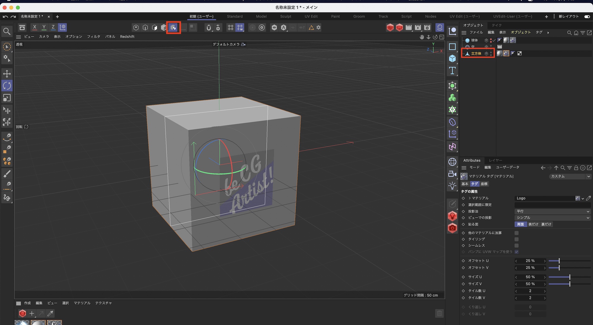 マテリアルタグを選択して、属性マネージャの「オフセットU/V」、「サイズU/V」、「タイル数U/V」、「くり返しU/V」からマテリアルやテクスチャのサイズなどを変更できます。