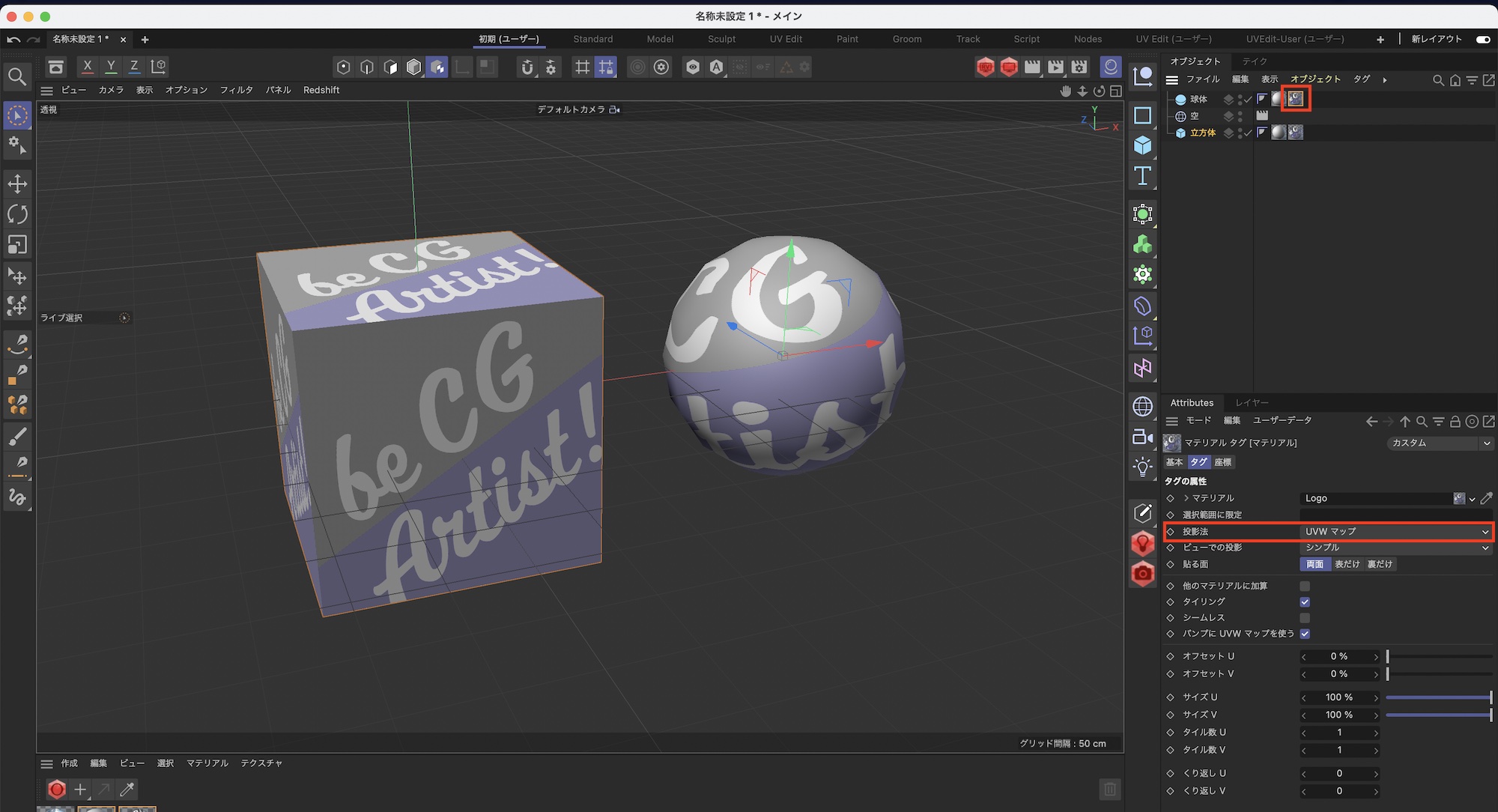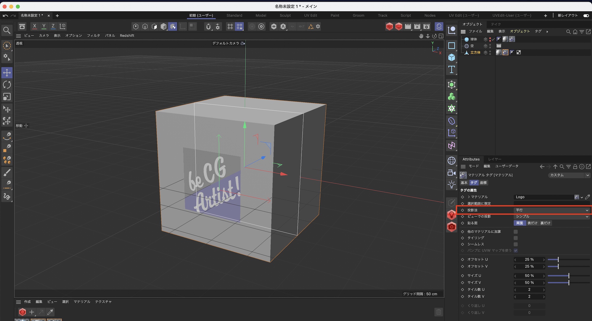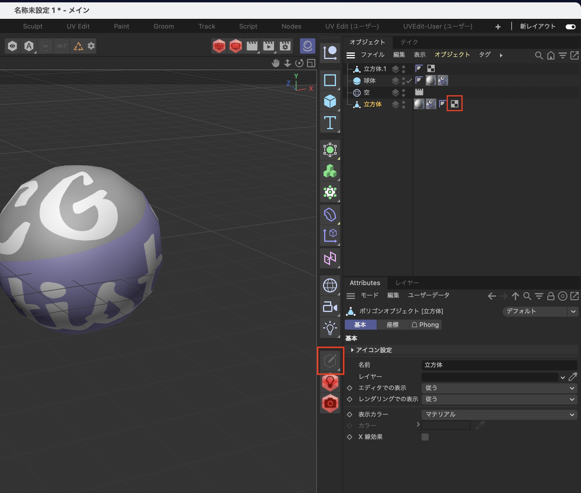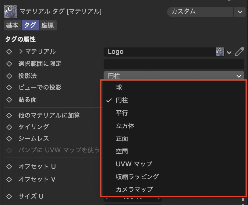 マテリアルがどのように投影されている投影されているかは、オブジェクトマネージャのマテリアルタグをクリックし、属性マネージャの「投影法」の部分から確認を行うことが出来ます。デフォルトでは「UVW マップ」となります。