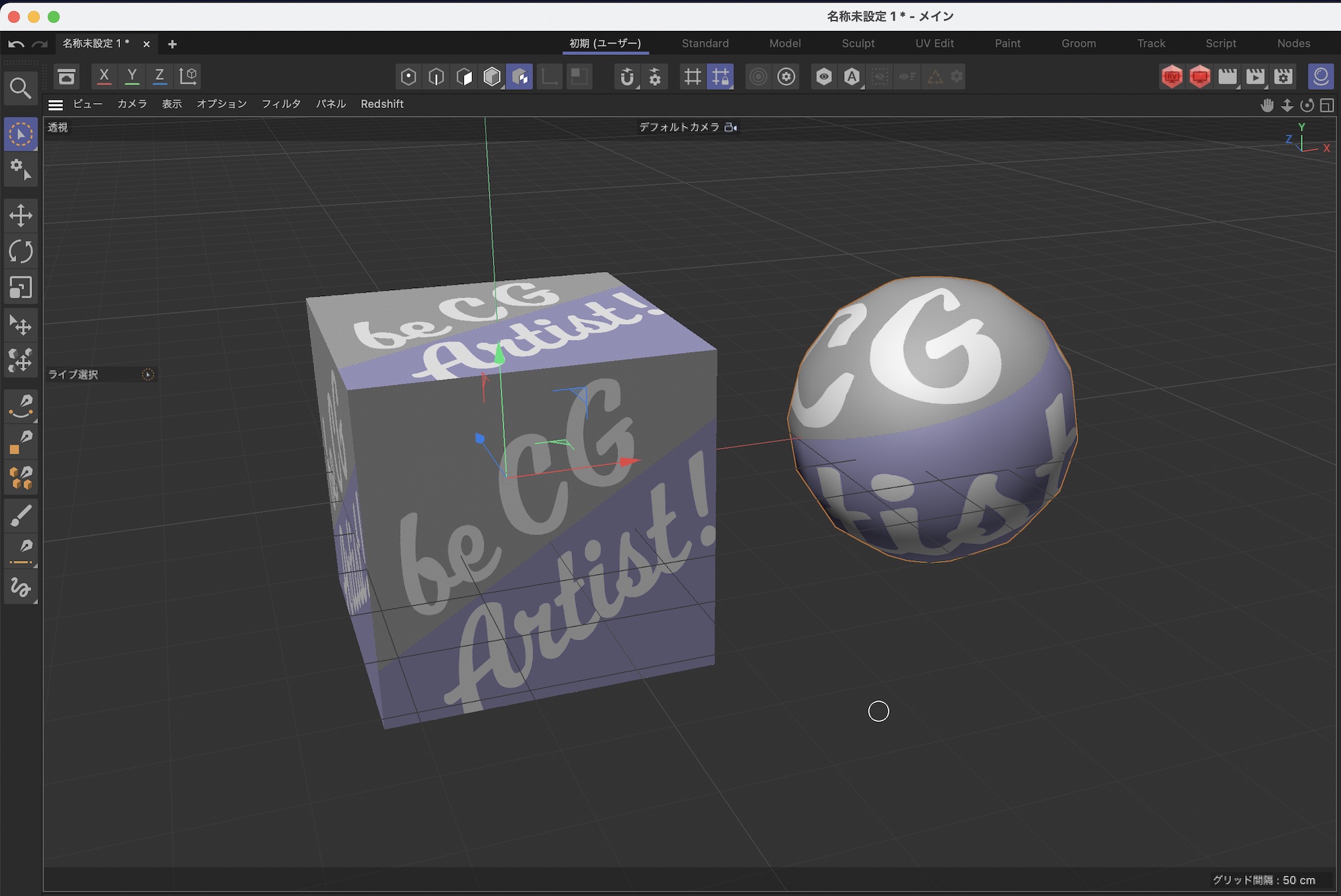 下のオブジェクトを参考に見ていきましょう。こちらのシーンでは立方体と球体のプリミティブオブジェクトを追加しており、2つに標準マテリアルをそれぞれ適用させています。