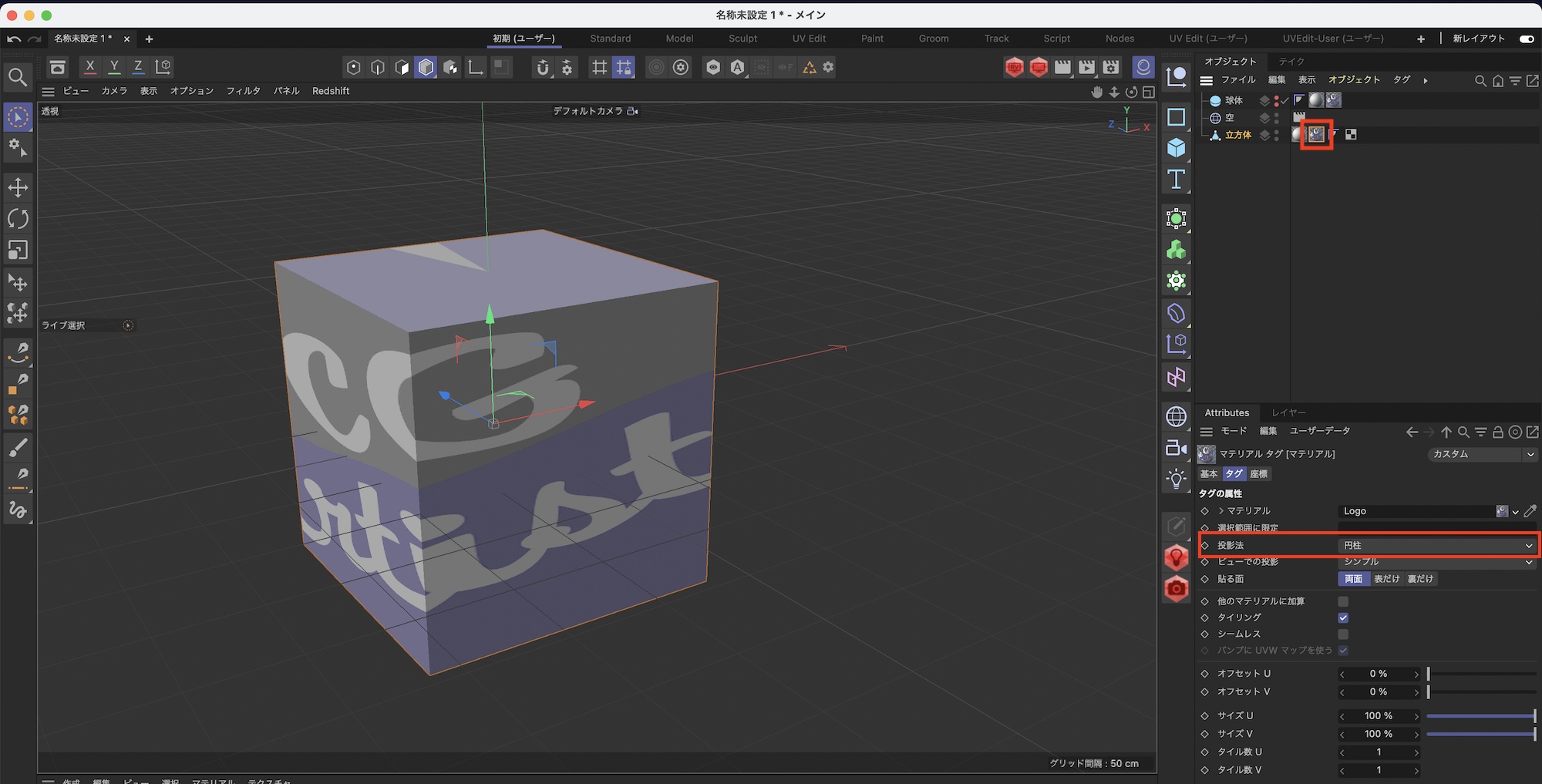 今回はUVWマップは使用せずにマテリアルの投影を行いたいので、立方体オブジェクトのマテリアルタグを選択して、試しに投影法を「円柱」にしてみると上のような感じになりました。