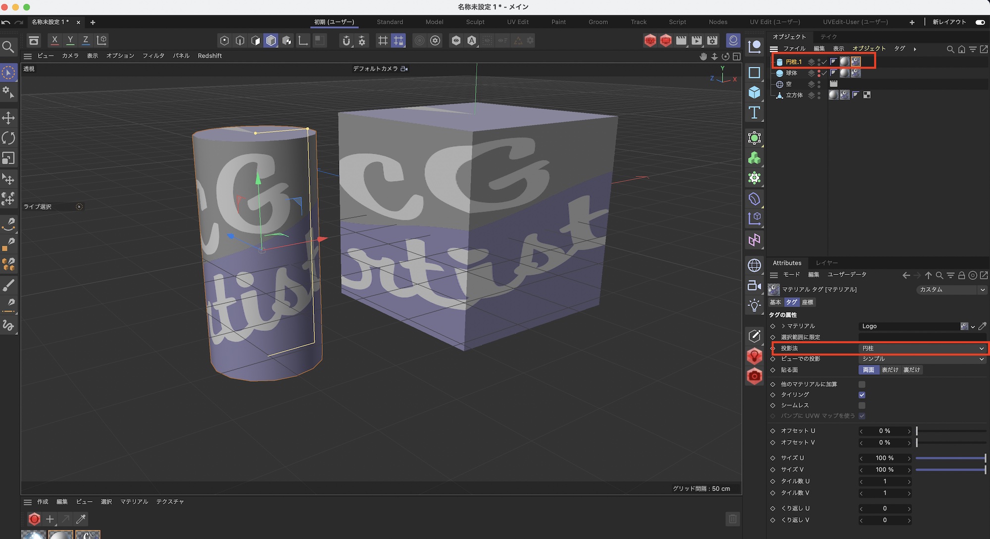 このようにマテリアルの「投影法」は反映させるオブジェクトの形によって投影方法を変えており、UV展開を行わない場合はこの項目から最適な投影法を選んでテクスチャを適用させることが出来ます。