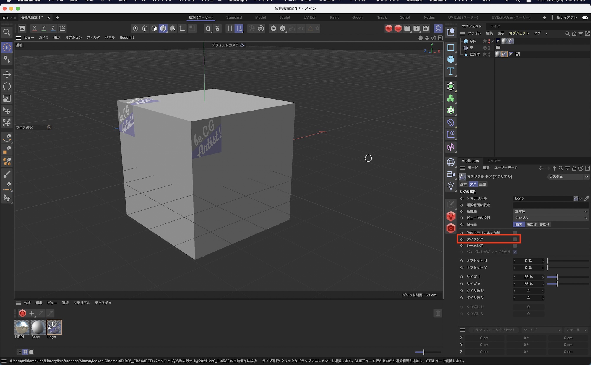 マテリアルのタイリングが必要ない場合は「タイリング」のオプションをオフにすると良いでしょう。