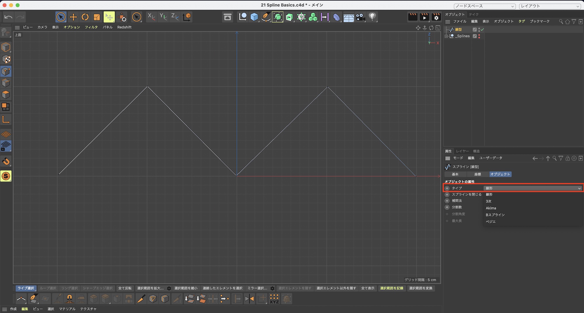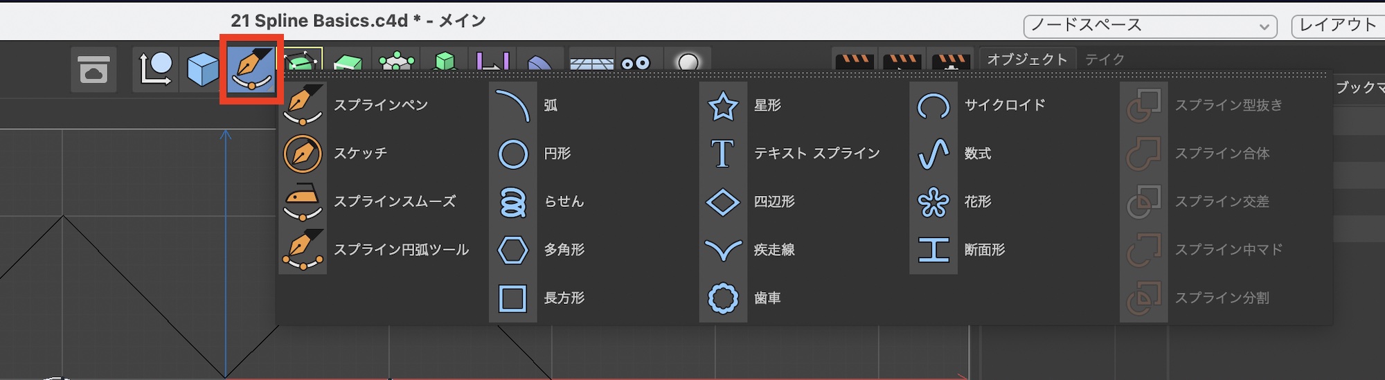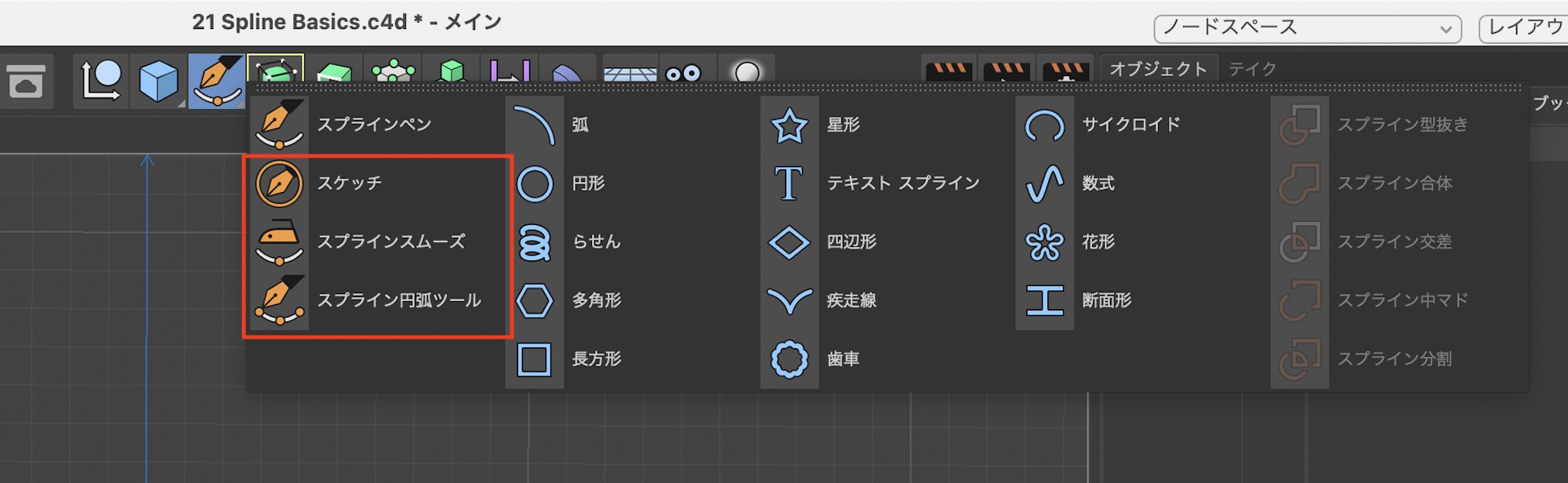 スプラインのタイプの変更はスプラインペンでスプラインを作成する前にオブジェクトマネージャから変更するか、作成した後でスプラインを選択して「タイプ」から変更することも可能です。