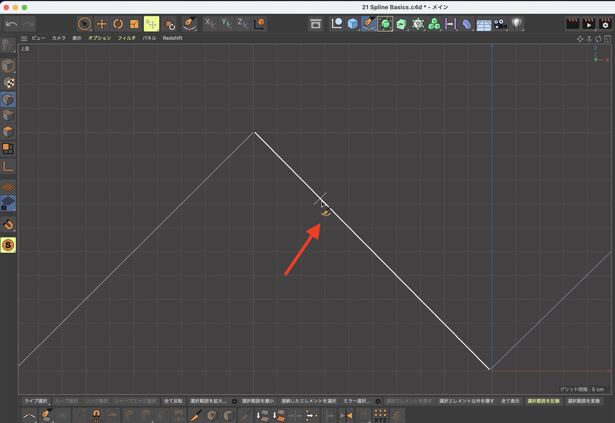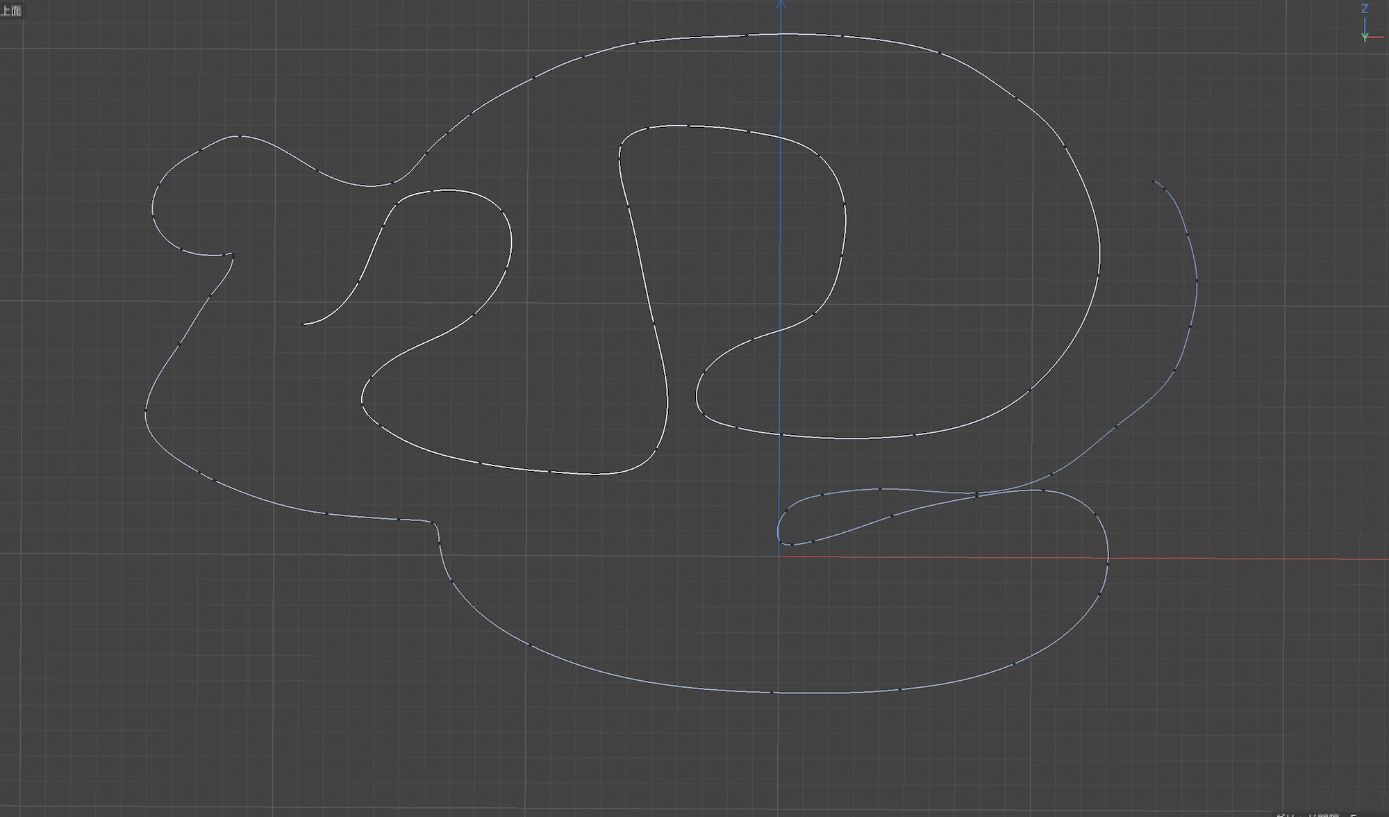 上面などのビューに切り替え、スプラインペンを使ってビューポート内を描画していきます。操作についてはIllustratorやAfter Effectsのパスを作成する時とほぼ同じです。グリッドをガイドにして作成していくと良いでしょう。