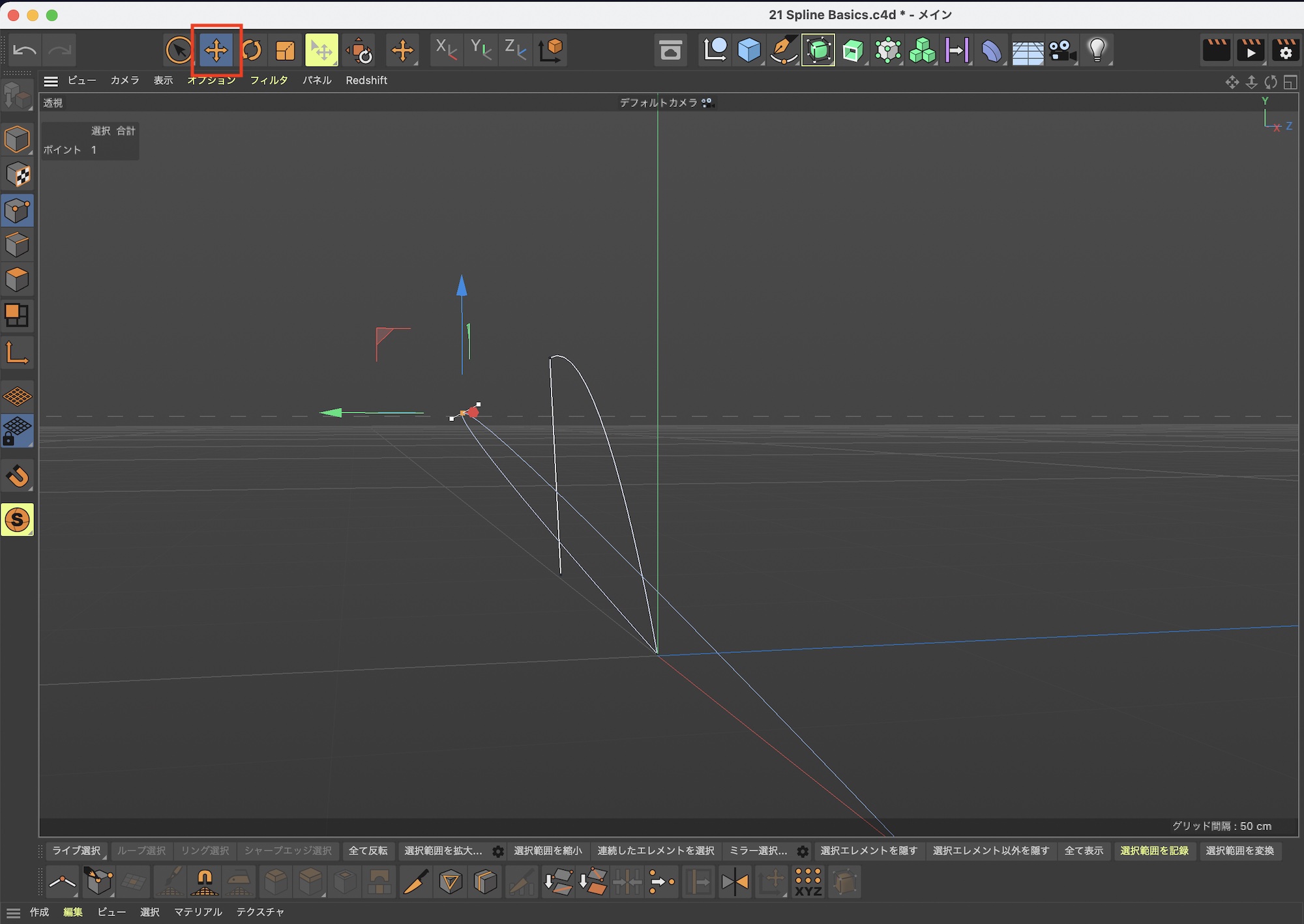スプラインを作成した後で透視ビューに切り替えると、スプラインを三次元で編集できます。位置ツールを使って最終的な形を作成していきましょう。