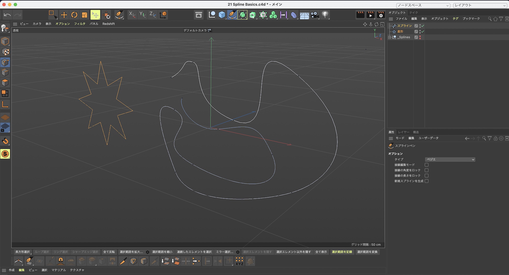 スプラインで作成されたポイントはスプラインペンまたは選択ツールを使って位置やポイントの追加や削除、ベジェ曲線の調整などが行なえます。