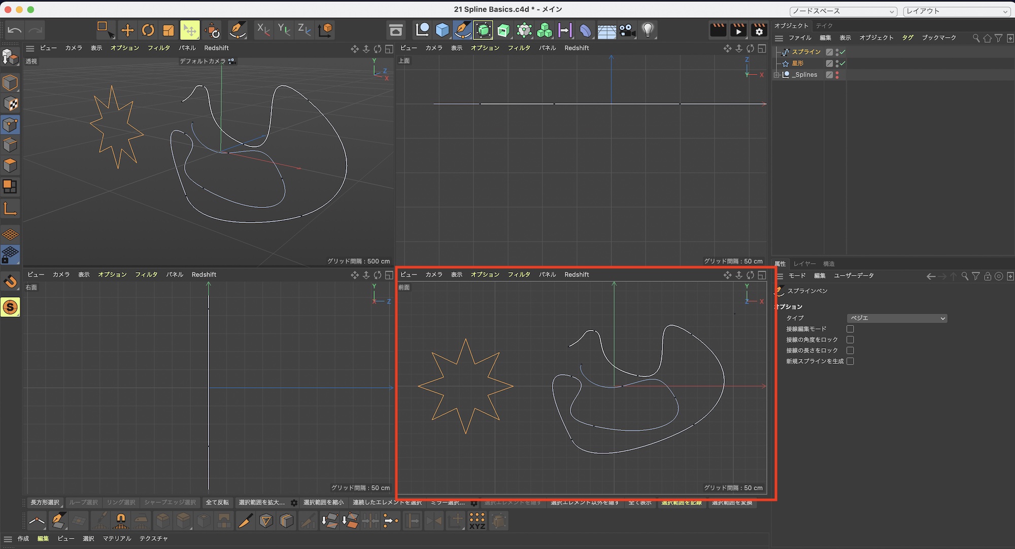 スプラインはポイントとエッジを使ったものであるため、追加またはスプラインを作成する際は「透視」ビューではなく、上面や全面など二次元のビューから作成することをおすすめします。