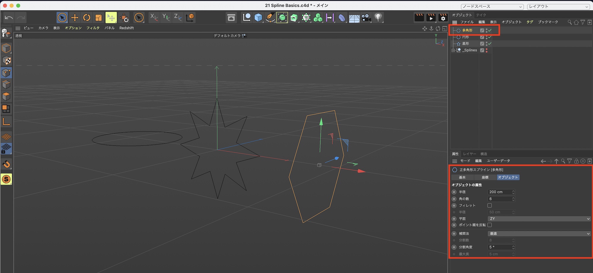 星型や円形、らせんといったプリセットで用意されているスプラインを追加すると、デフォルトでは「XY軸」の方向にスプラインが配置されます。
