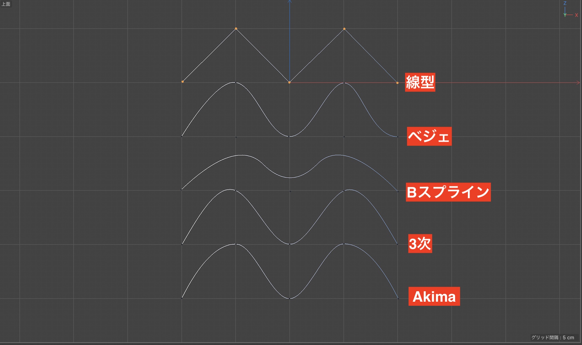スプラインでは線型、ベジェなど様々なタイプが用意されています。