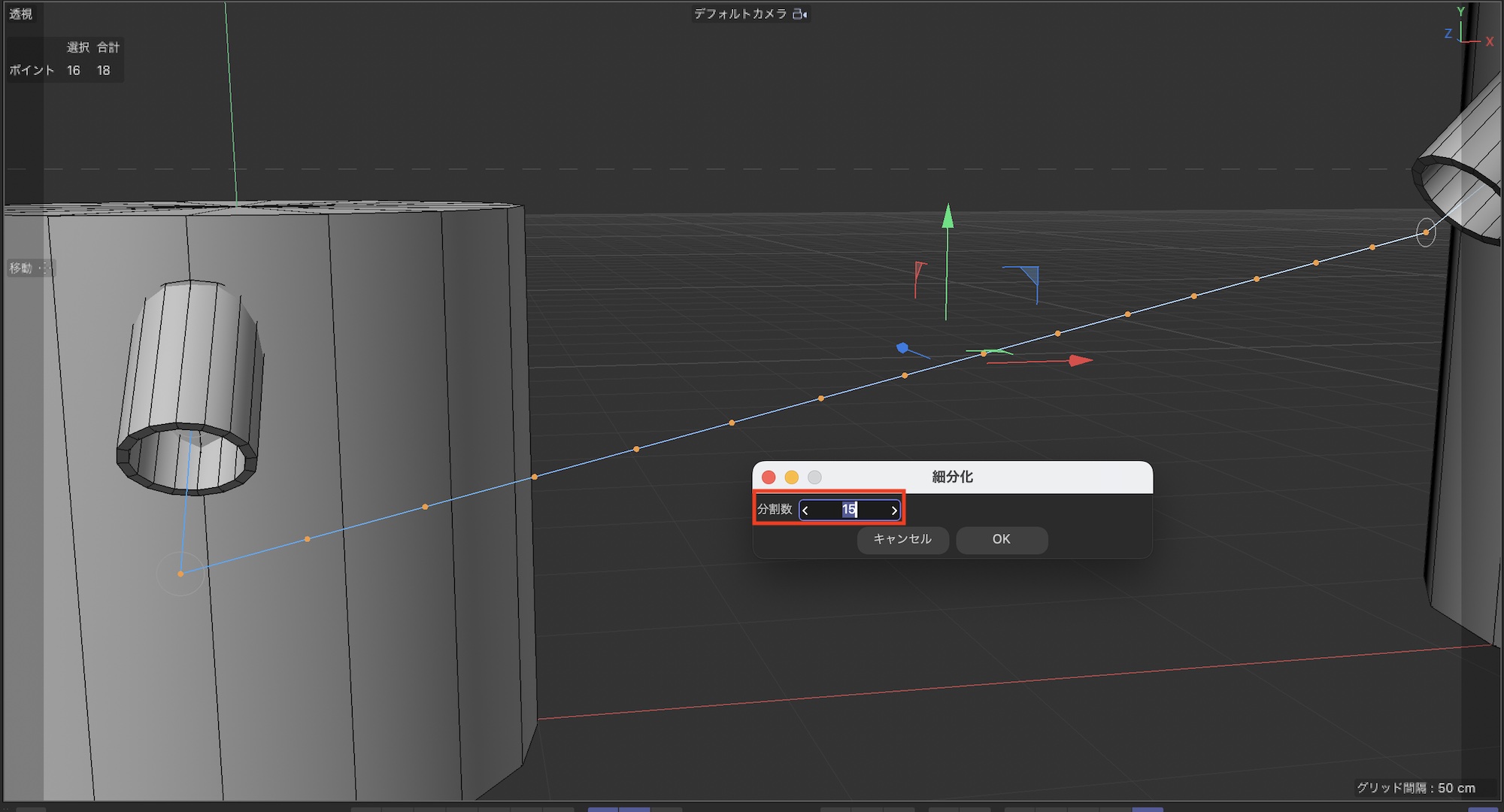 ポイントモードにした上でスプラインの2つ目と3つ目のポイントを選択し、右クリック「細分化」の歯車アイコンをクリックして「15」にします。