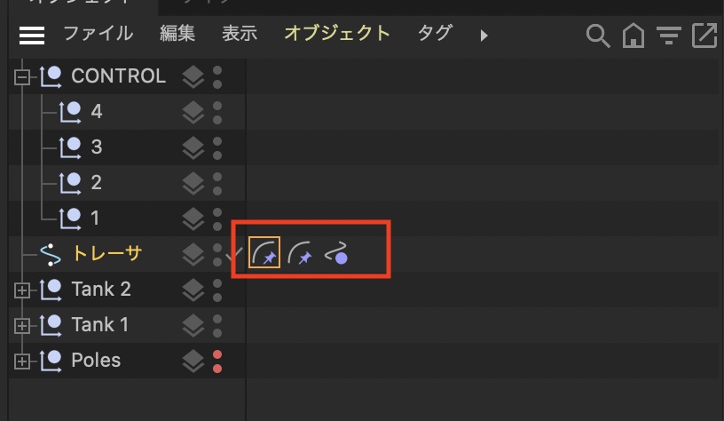 トレーサーはMoGraphのツールの一つで、複数のオブジェクトをトレーサーの中に配置すると、オブジェクトの位置をベースにトレース(追跡)してくれます。
