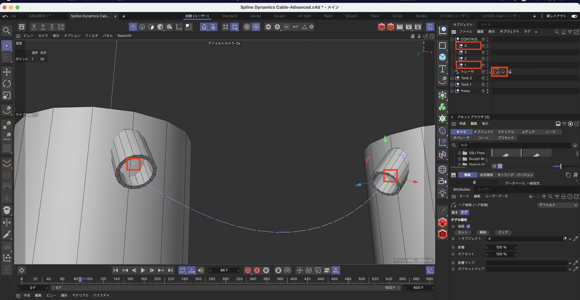 スプラインダイナミクス(Spline Dynamics)はスプラインのポイントを固定するだけで簡単にスプラインをケーブルのようなオブジェクトを作成することができます。