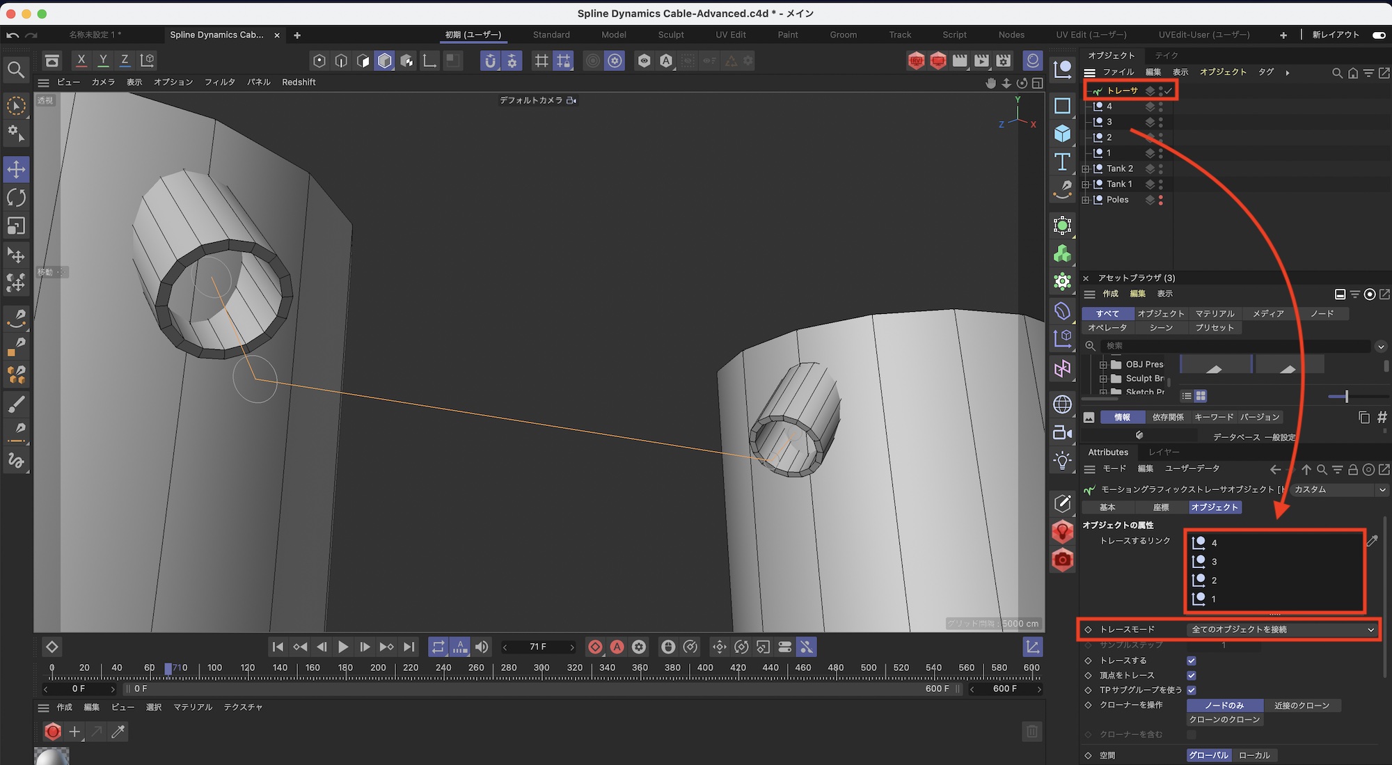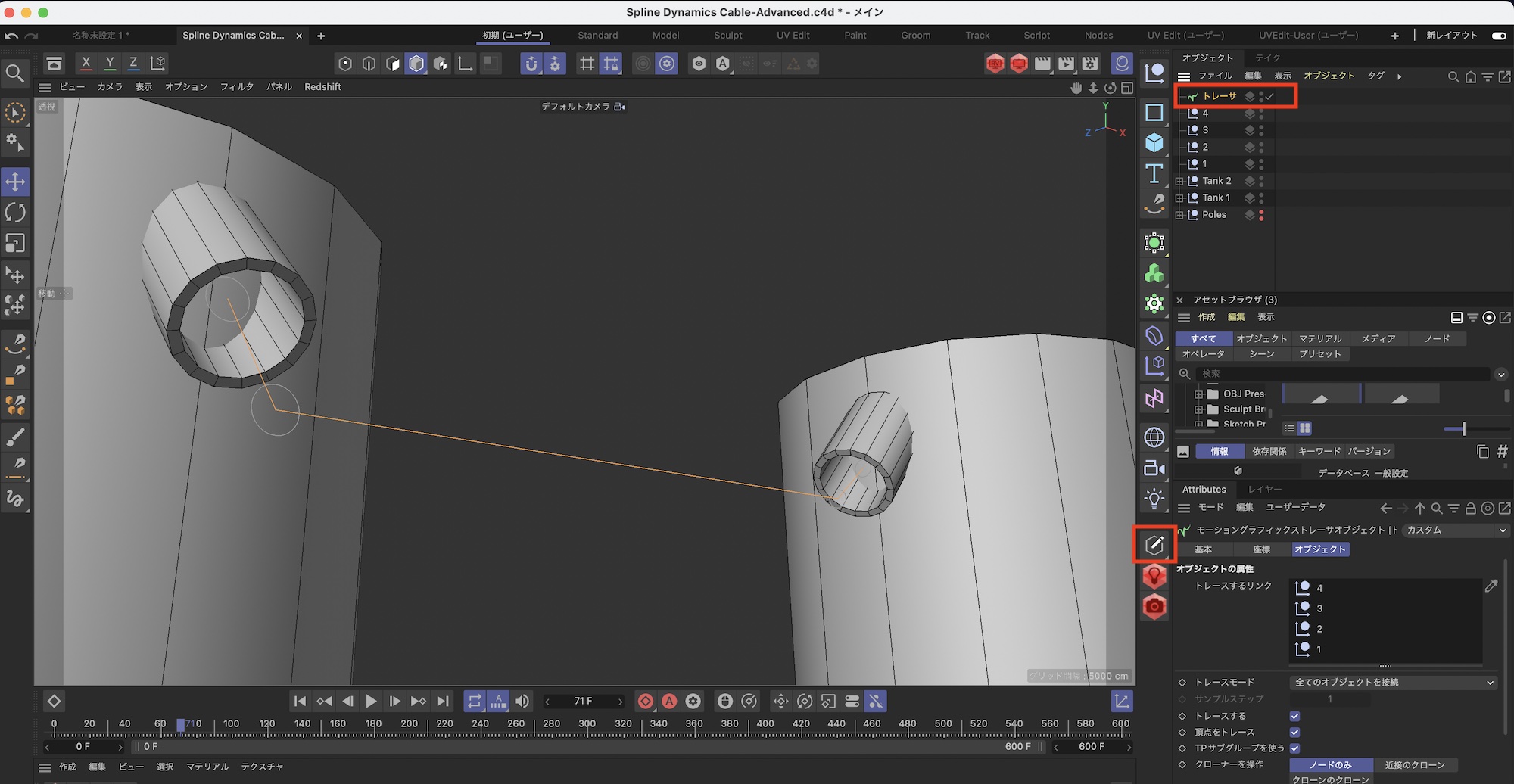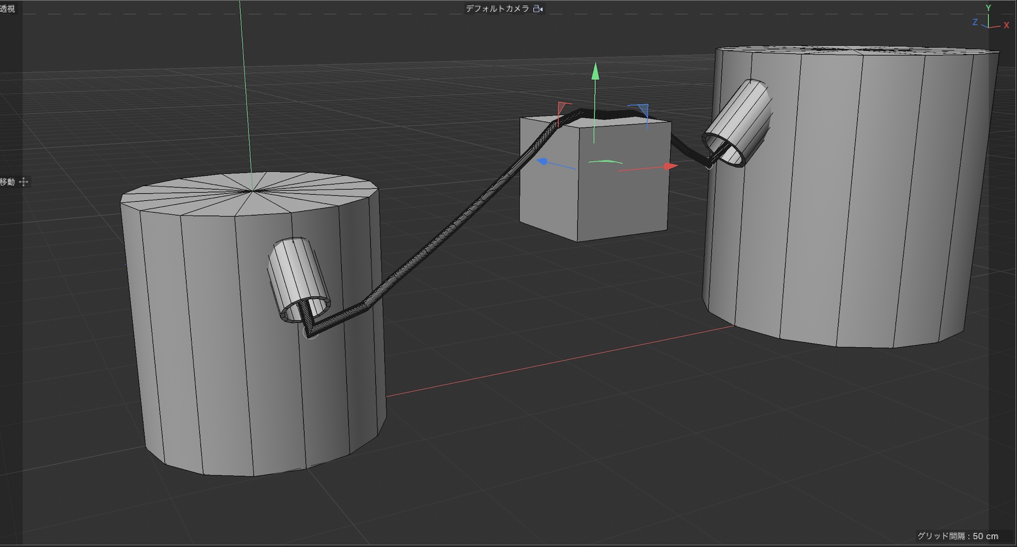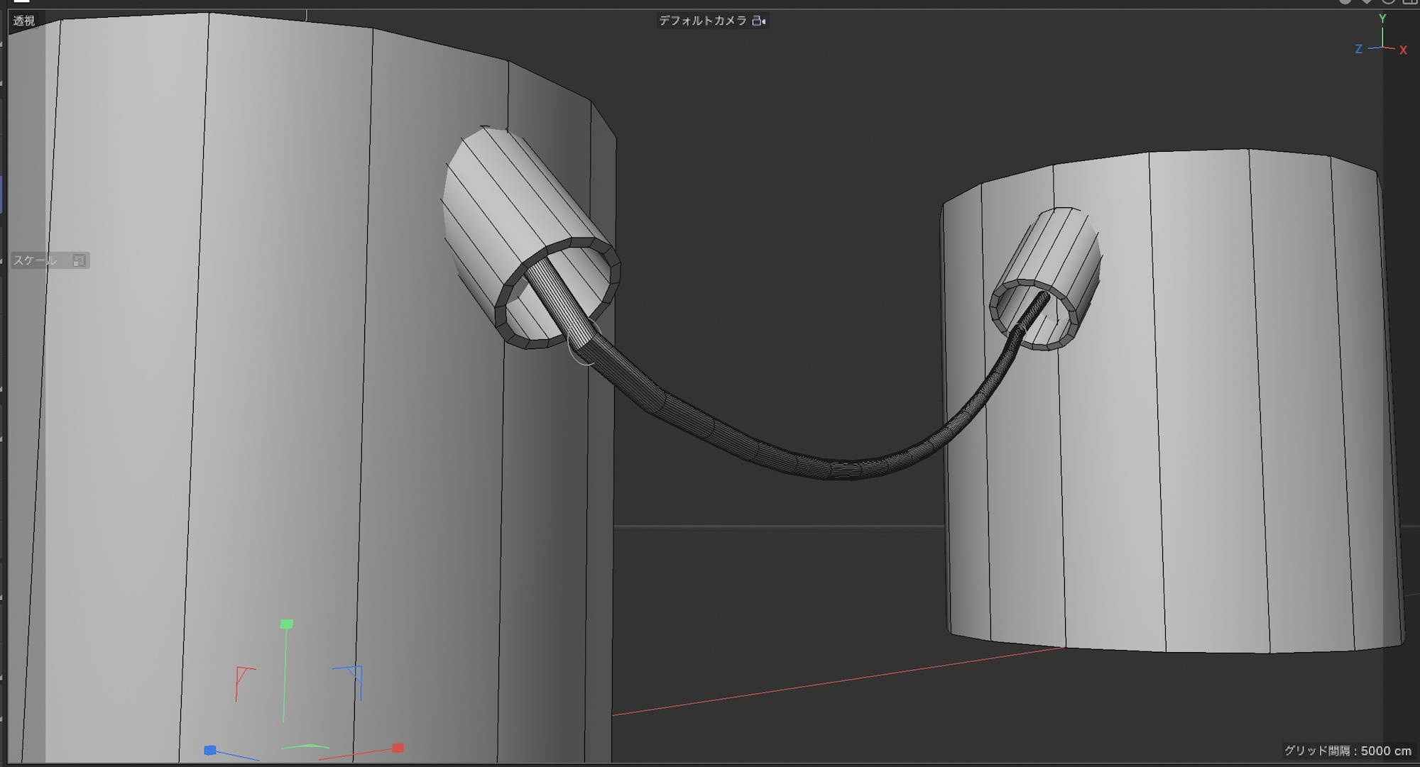 上の例のように円柱にあるチューブからケーブルが現れ、もう一つの円柱に接続させたい場合、スプラインペンを使って作成すると少し違和感があり、調整がしづらいです。この様なケースでおすすめしたいのが「トレーサー」を使う方法です。