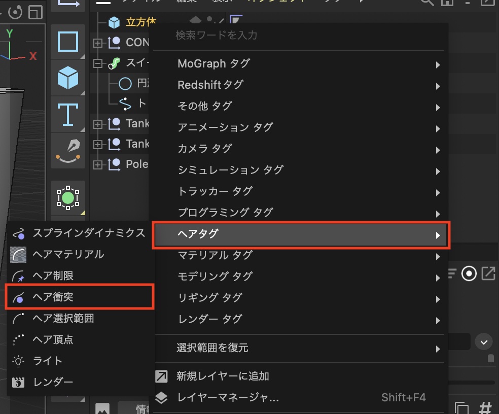 先ほど作成したケーブルに立方体を追加してケーブルが衝突するようにします。立方体を右クリックし、「ヘアタグ」から「ヘア衝突」をクリックしてタグを追加しましょう。