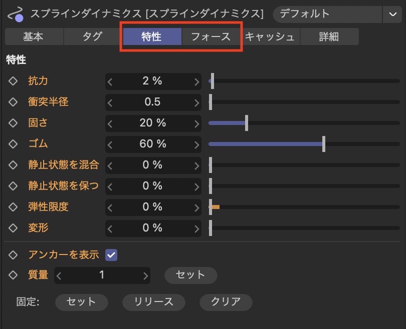 スプラインダイナミクスタグを選択し、属性マネージャの「特性」と「フォース」の項目からスプラインの柔らかさや重力などの設定を行うことができます。ゴムのような強度を作りたい場合など、ここから調整を行うと良いでしょう。