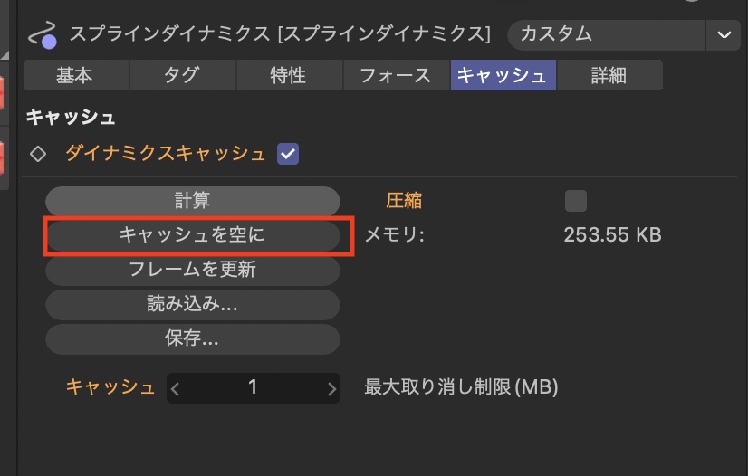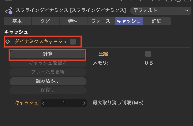 キャッシュを使用するにはスプラインダイナミクスタグを選択して「キャッシュ」のタブにある「ダイナミクスキャッシュ」にチェックを入れて「計算」をクリックするだけです。