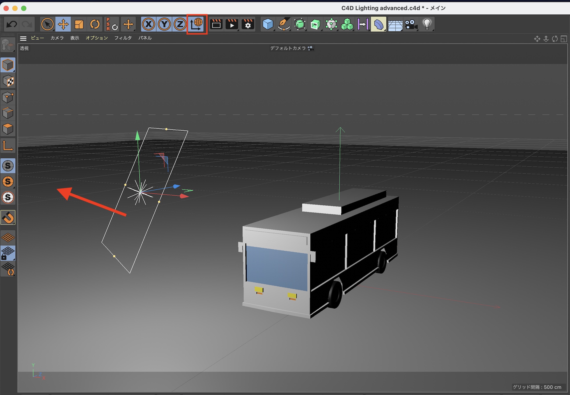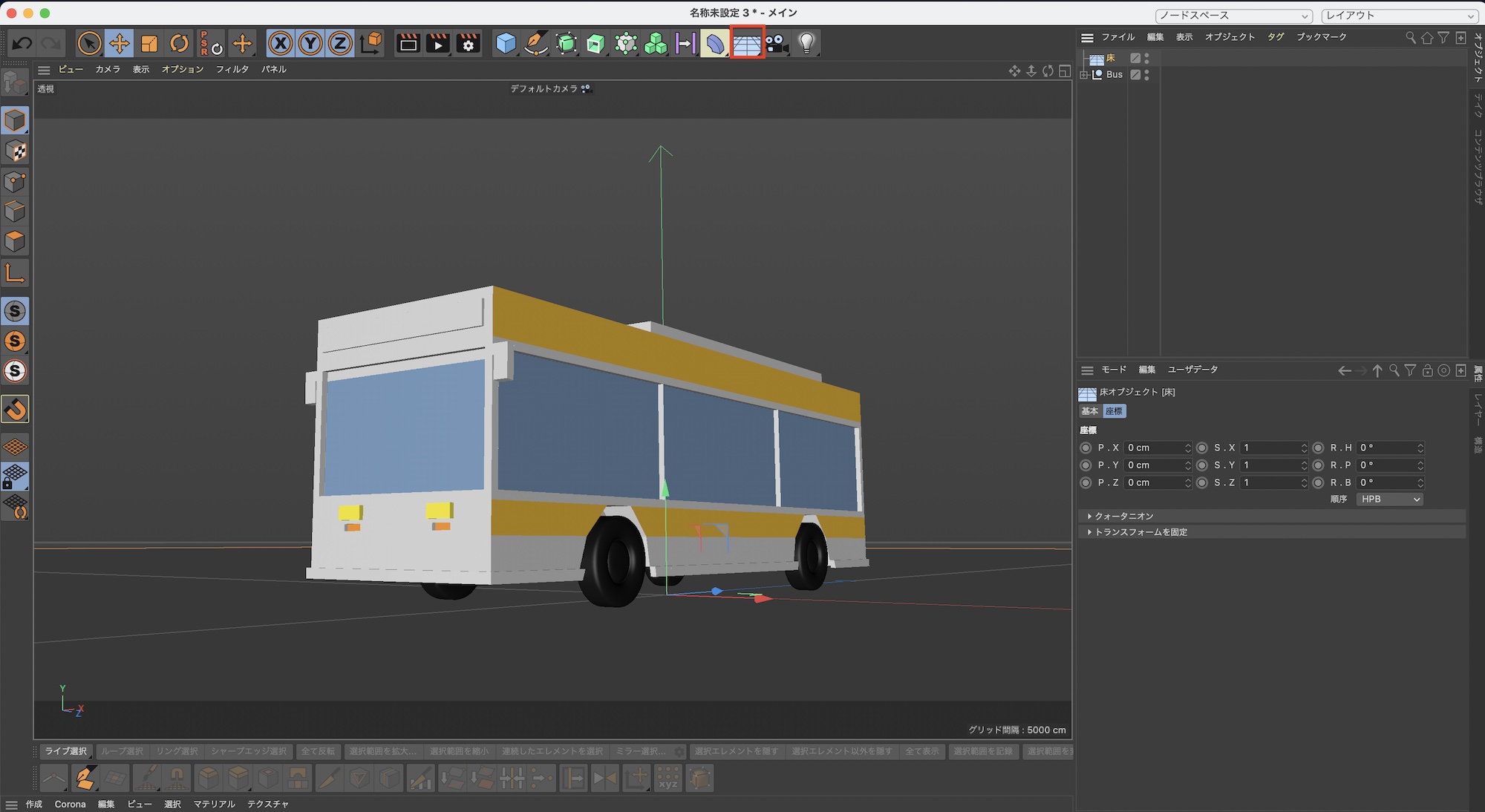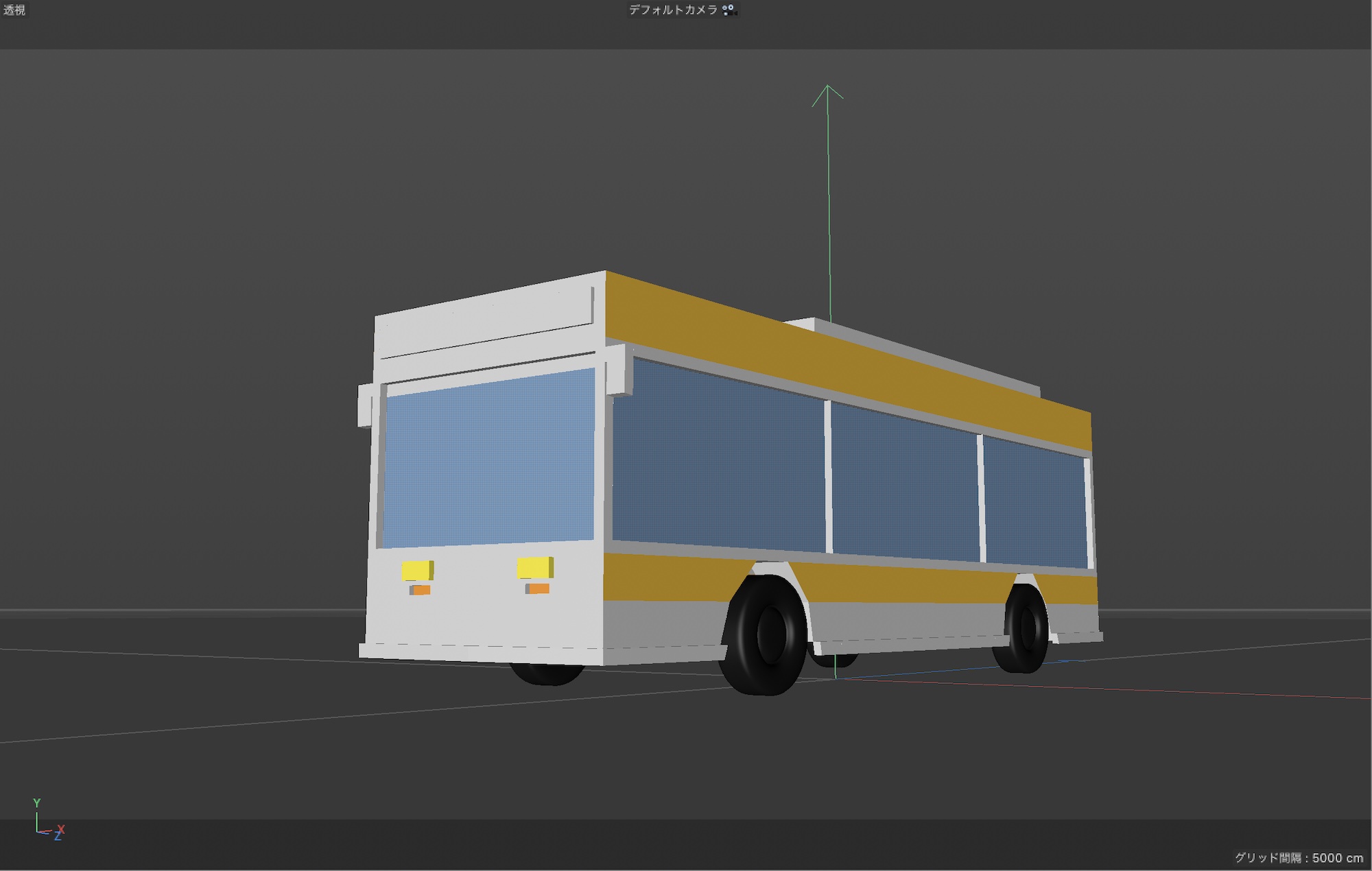 ライトを追加する前にカメラを動かして最終フレームを確定します。筆者は少しローアングルに配置し、バスの全体像が見えるように斜めの向きに配置しました。このカメラアングルをベースにライトオブジェクトを追加していきます。