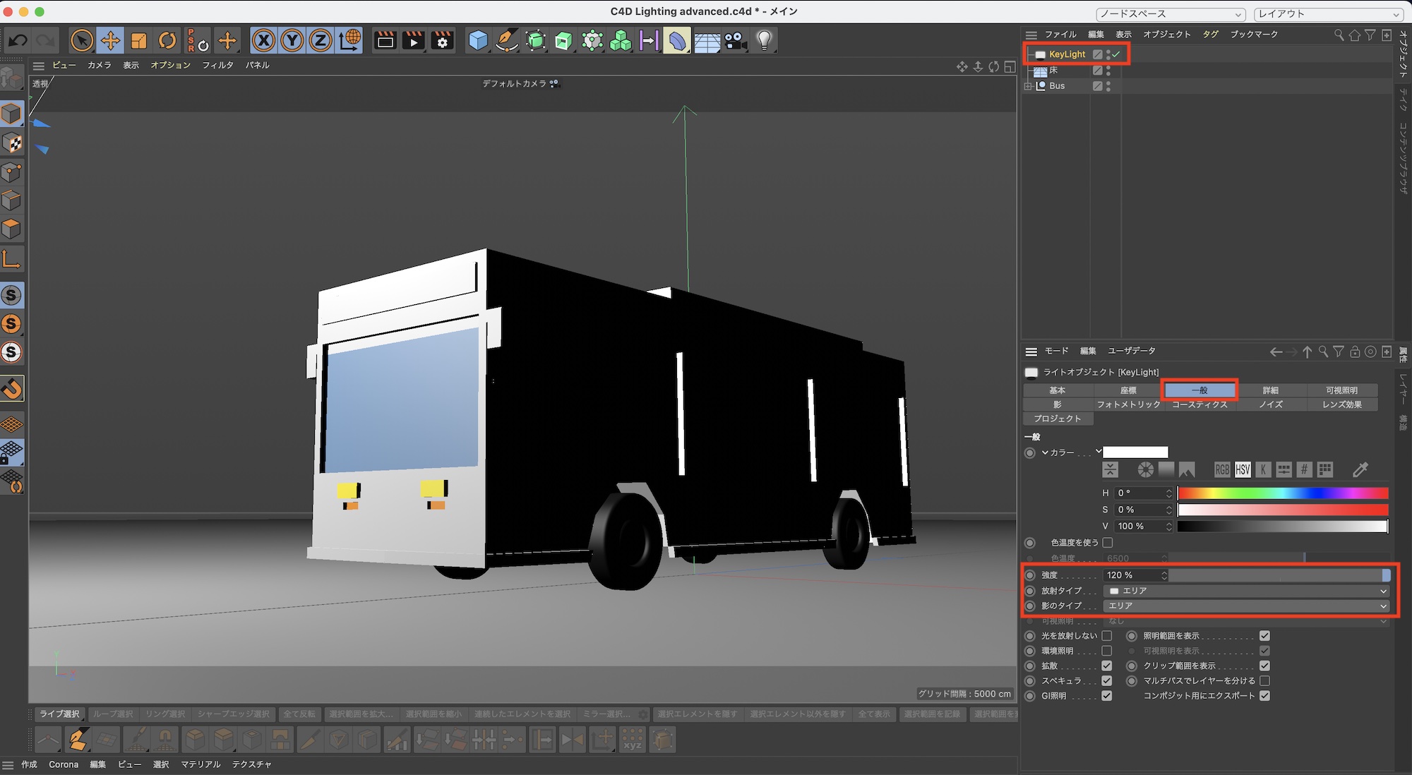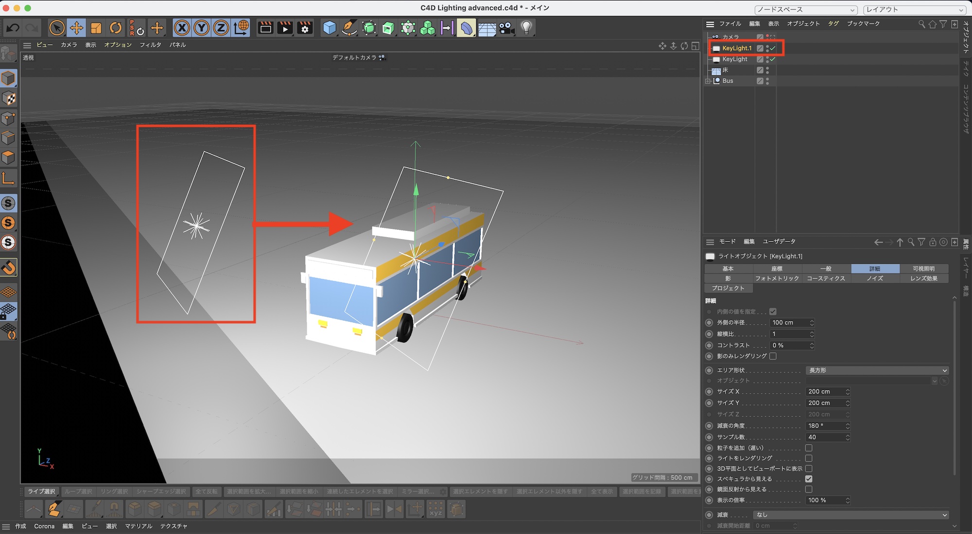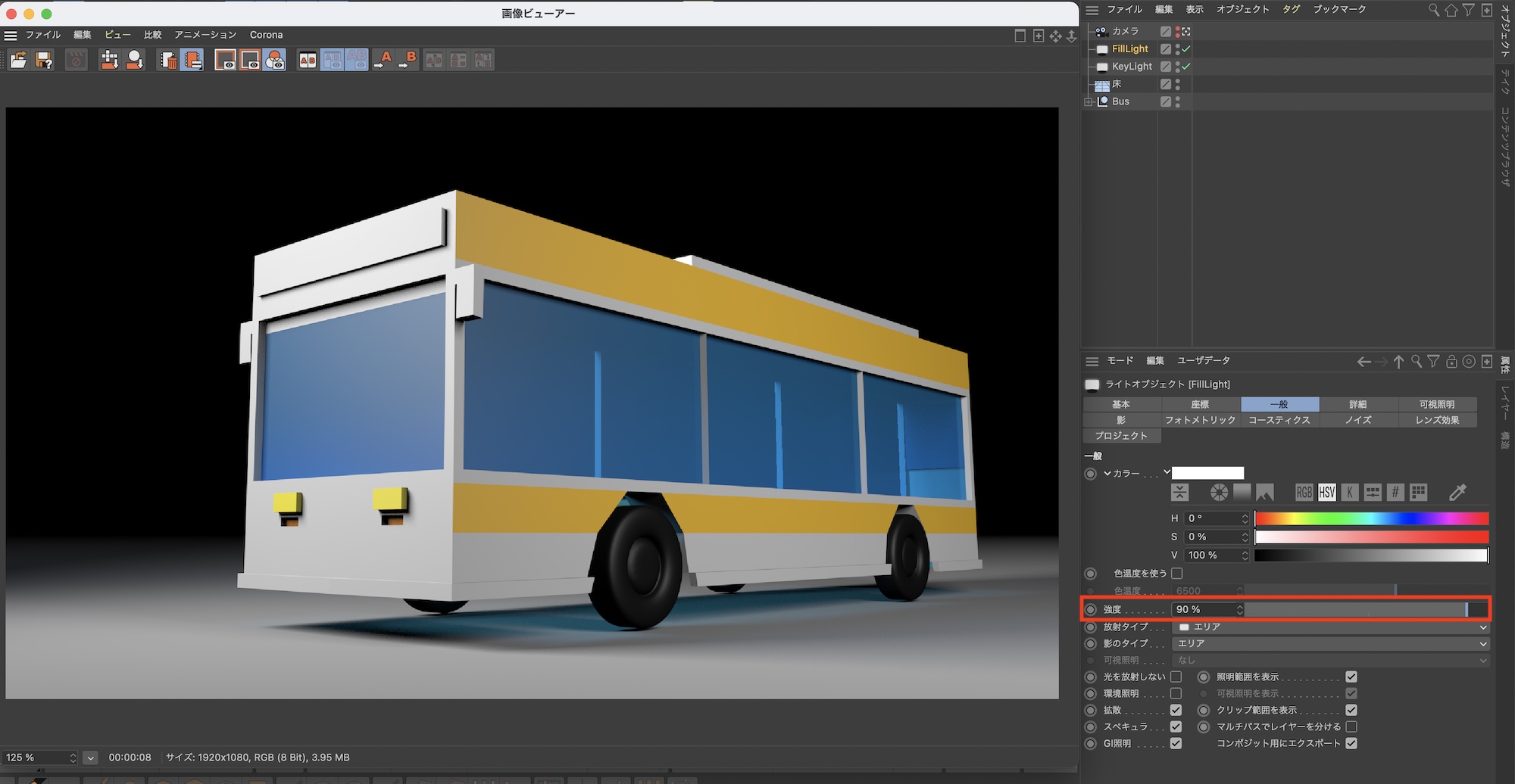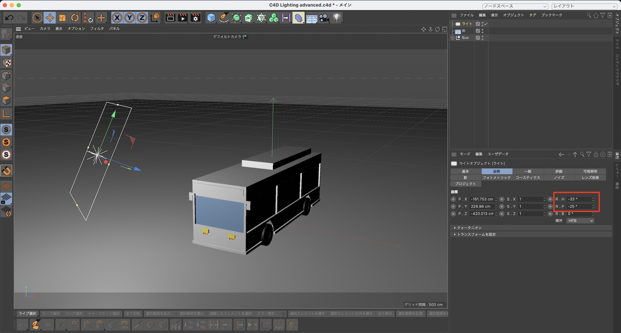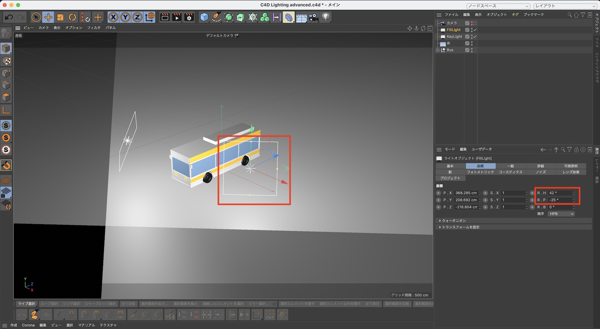FIllLightをバスの側面に光が当たるように座標を「R.H: 42°」、「R.P: -25°」のように変更します。