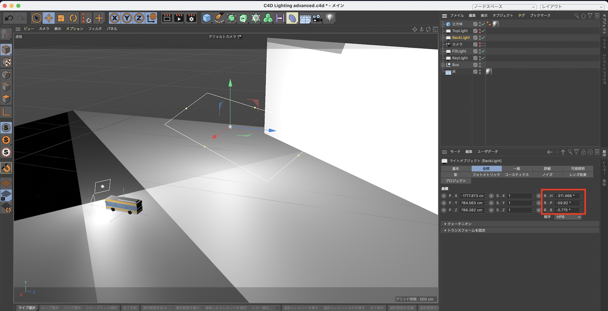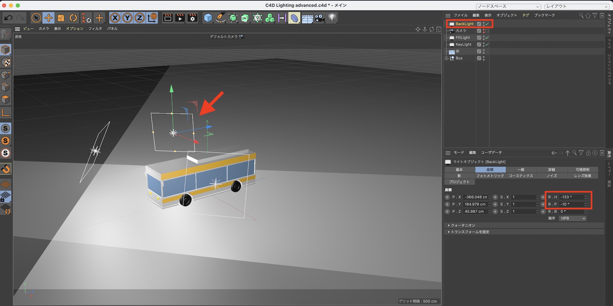 最後はバックライトです。先程と同じように「FillLight」を「Control(Cmd)」キーを使って複製し、バスの後ろに配置します。筆者の場合は座標を「R.H: -133°」、「R.P: -10°」のように設定し、名称を「BackLight」に変更します。