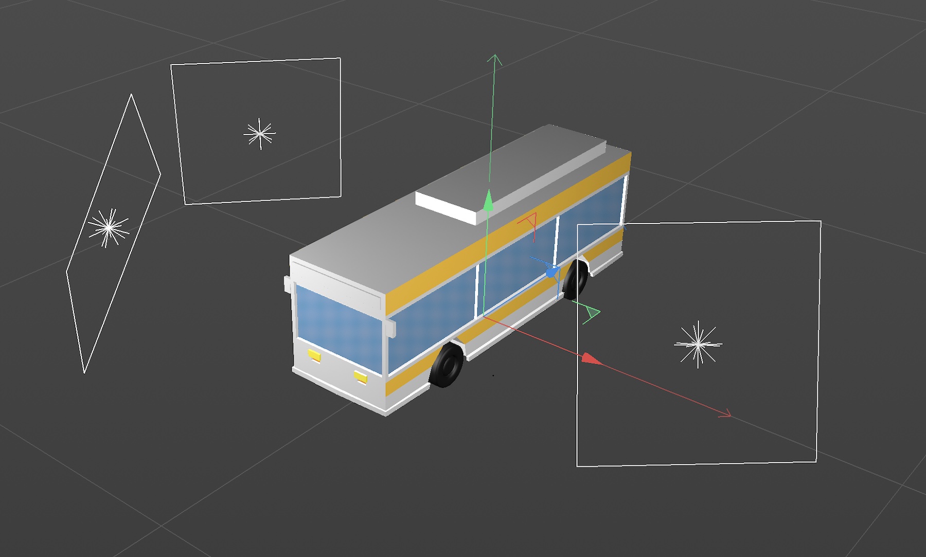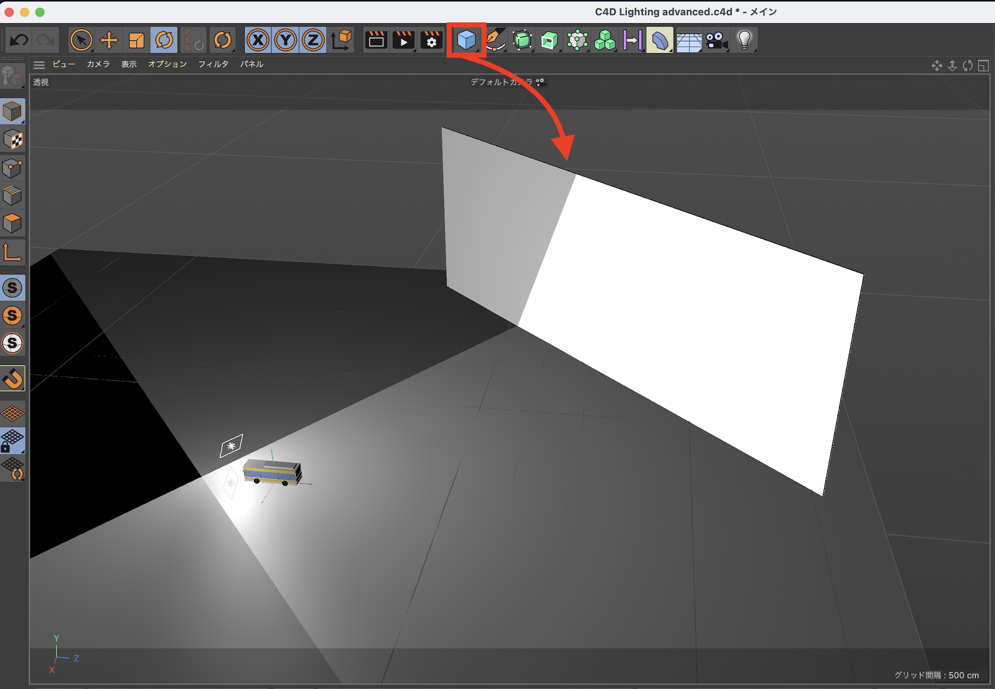 今回はローポリのバスのオブジェクトを使って三点照明を再現していきます。使用するライトオブジェクトは「エリアライト」のみです。