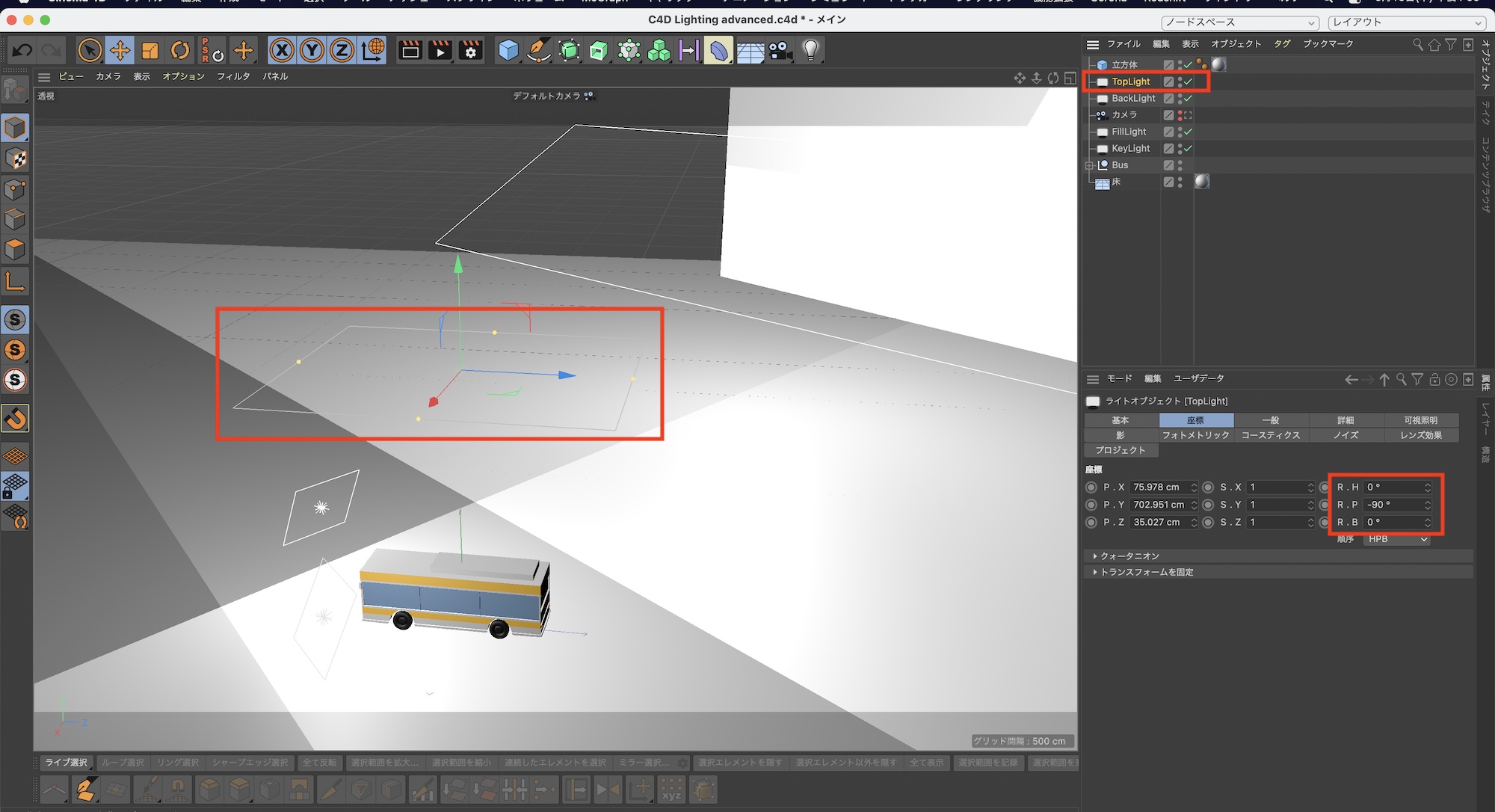 KeyLightを複製し、バスの真上に配置します。座標は「R.H: 0°」、「R.P: -90°」、「R.B: 0°」にし、強度を「100%」に変更して名称を「TopLight」などに変更します。