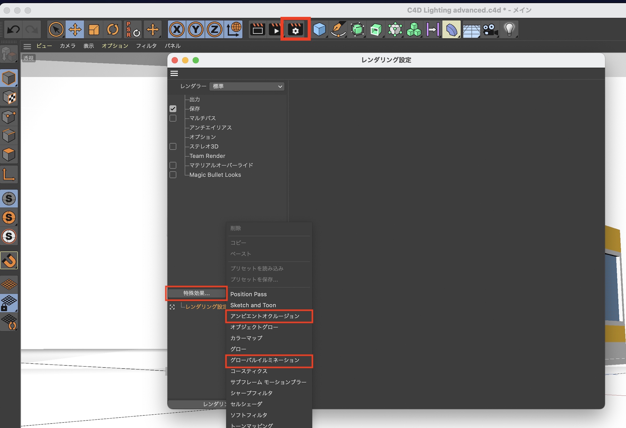 最後はグローバルイルミネーション(GI)とアンビエントオクルージョン(AO)をレンダリング設定の特殊効果から追加します。今回は特に設定を加える必要は無いので、この状態でレンダリングしてみましょう。