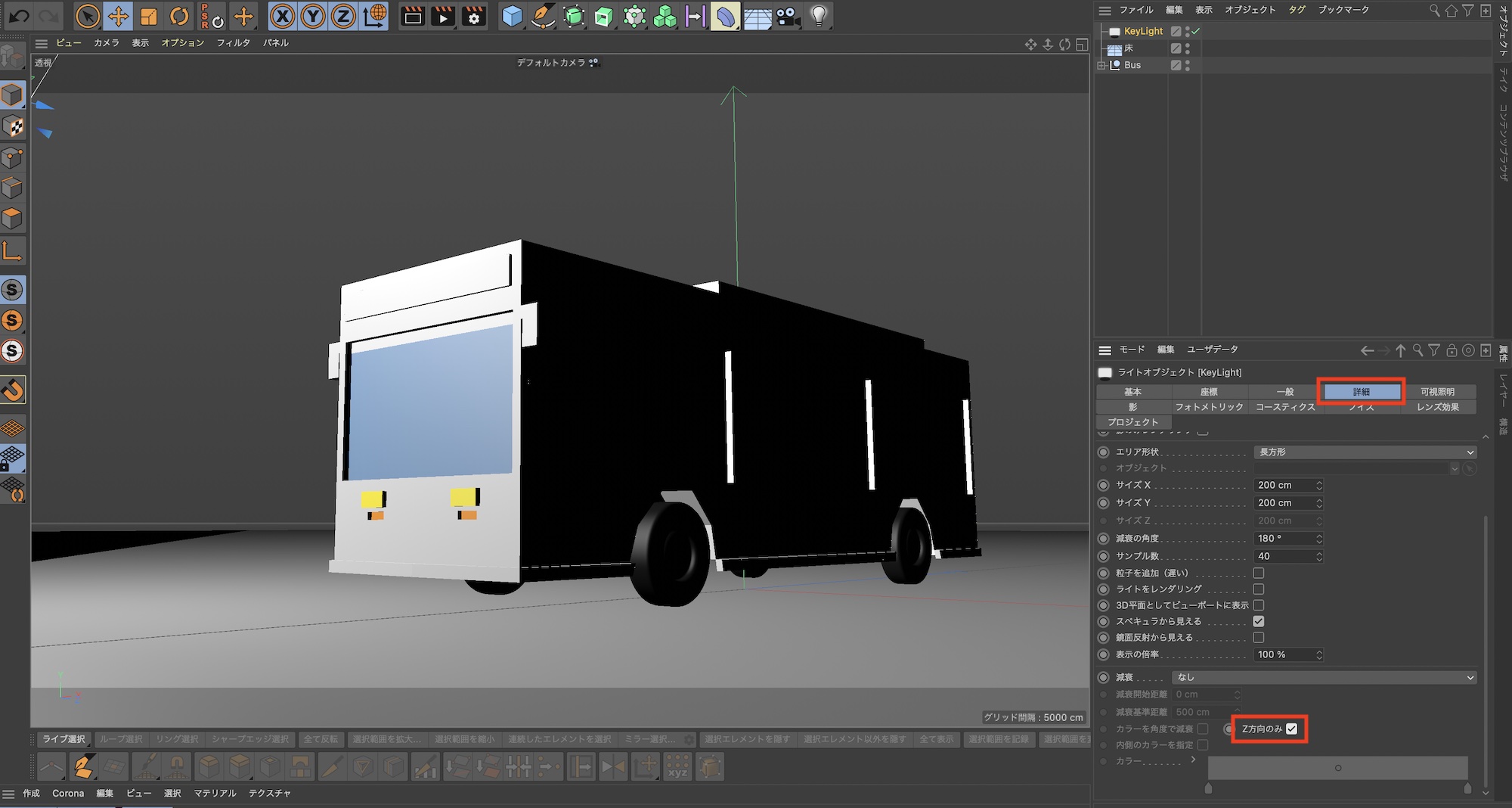 「詳細」の項目で「Z方向のみ」にチェックを入れましょう。この状態でレンダリングを行うと下のようになりました。バスの前方はハッキリ見えますが、側面は影になっています。