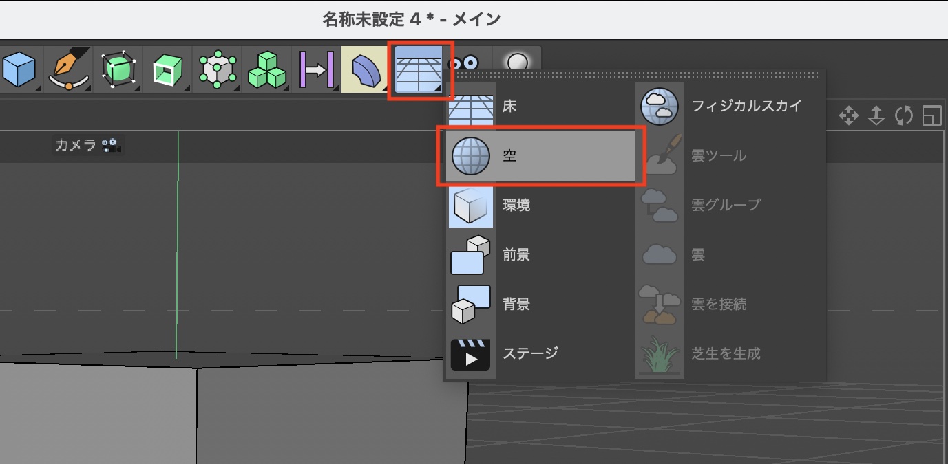 その後で上部メニューのから「空」オブジェクトを追加し、発光マテリアルをドラッグ・アンド・ドロップすればワールドにHDRIが反映されるようになります。
