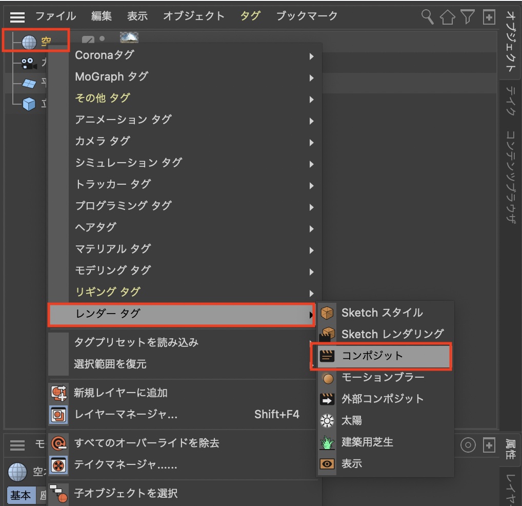 こちらはCinema 4Dの時と同じ操作方法になります。光だけは残し、HDRIの画像であるテクスチャを非表示させたい場合は「空」オブジェクトを右クリック、「レンダータグ」の「コンポジット」を追加します。