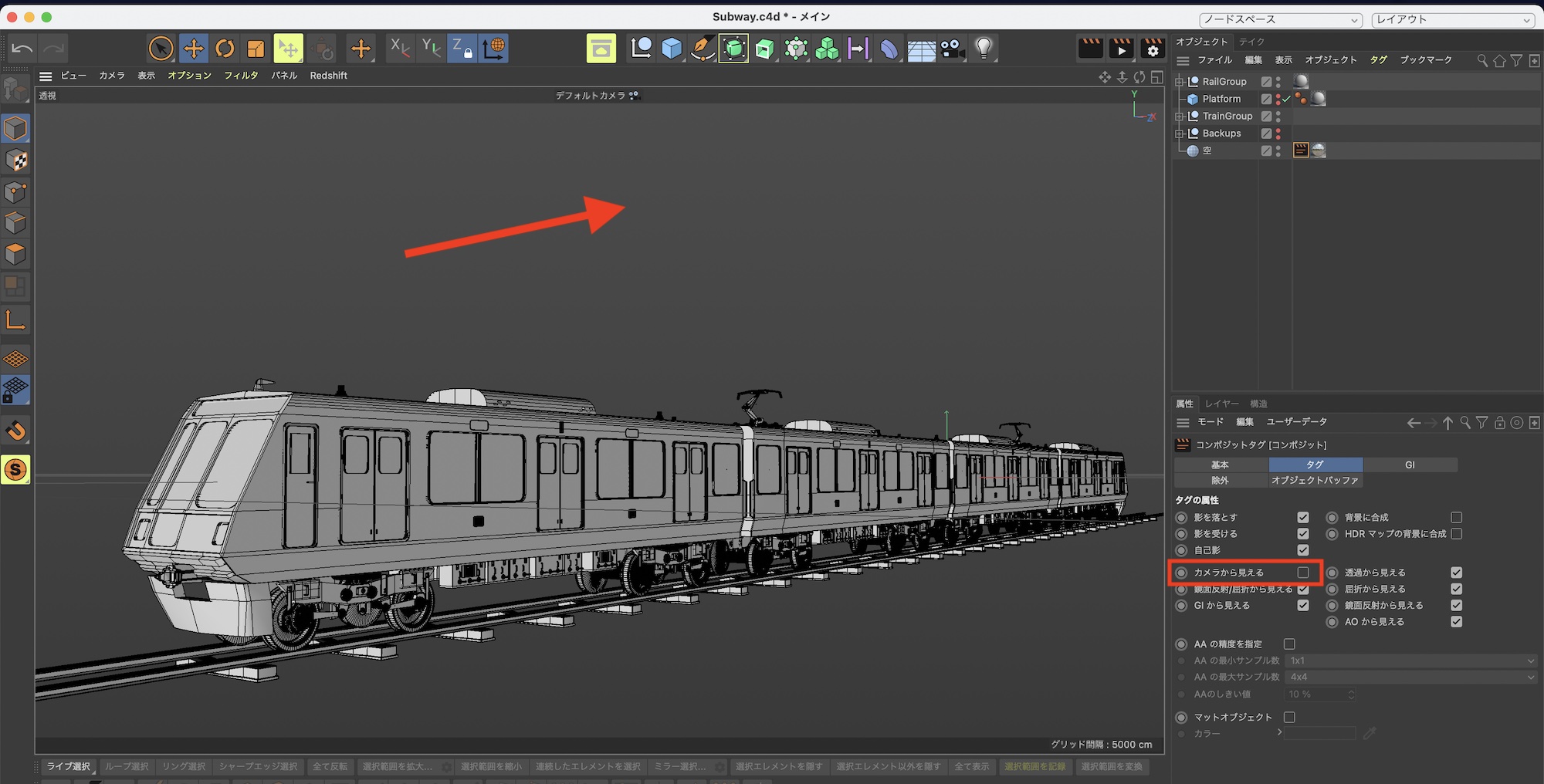コンポジットタグを選択し、属性マネージャの「タグ」にある「カメラから見える」のチェックを外せばテクスチャが表示されなくなります。